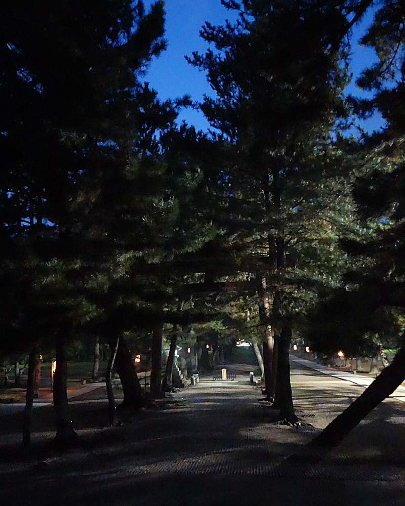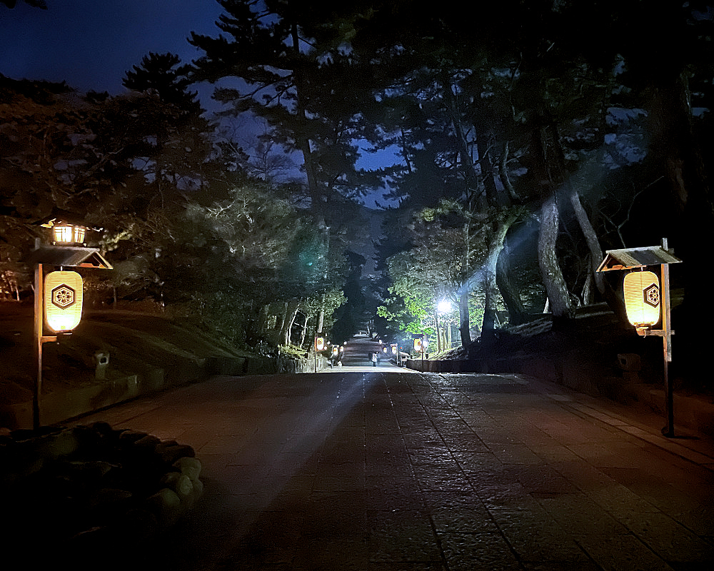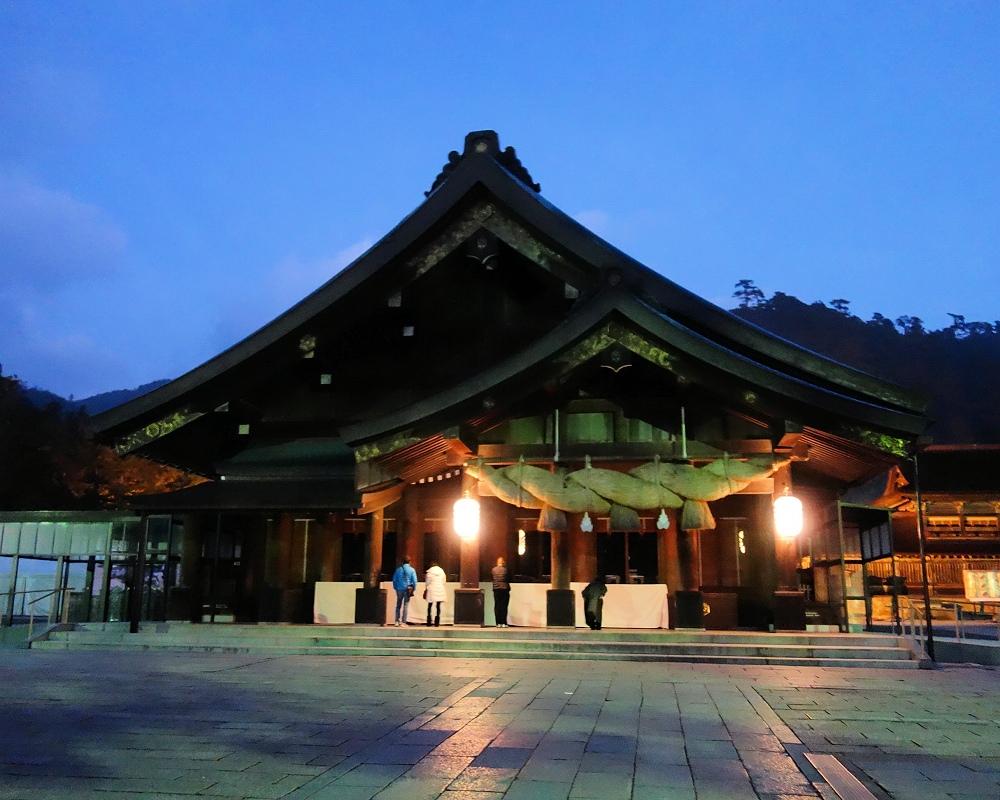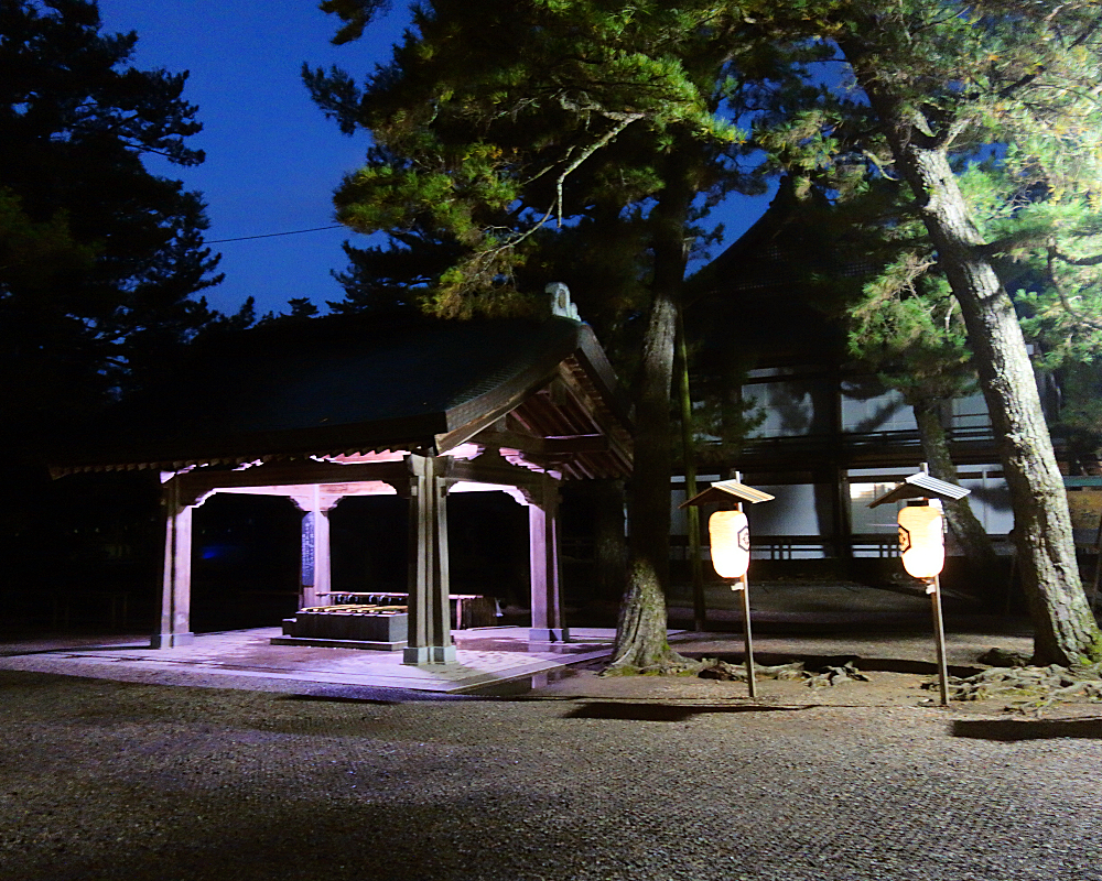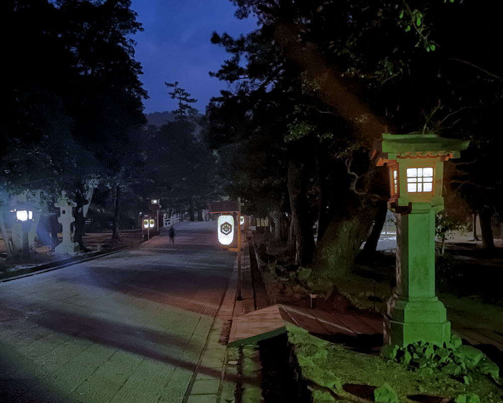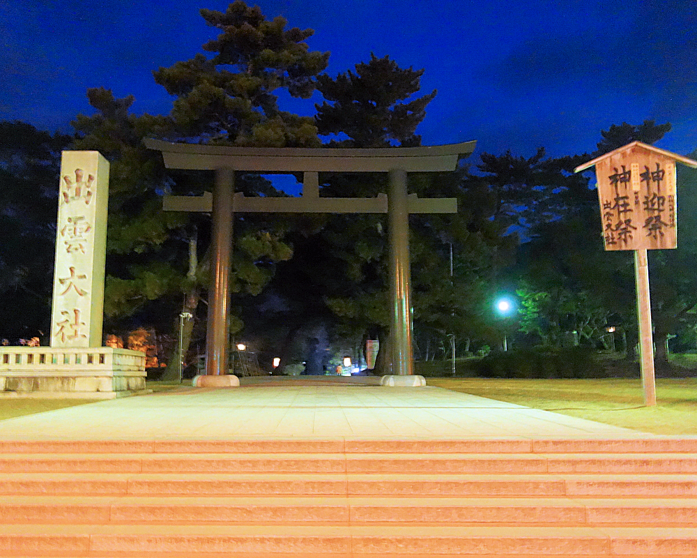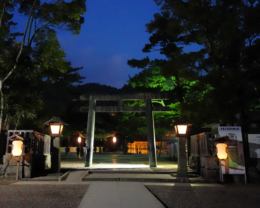 カメラの機能で写真では少し明るさが残っていますが、実際は真っ暗な出雲大社の境内。