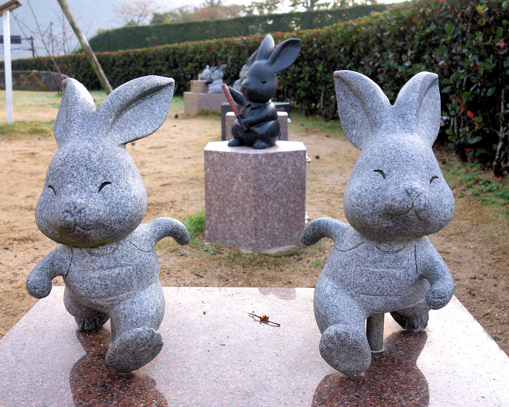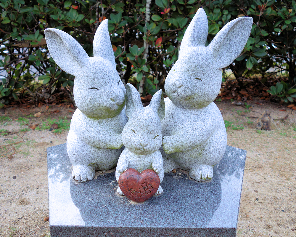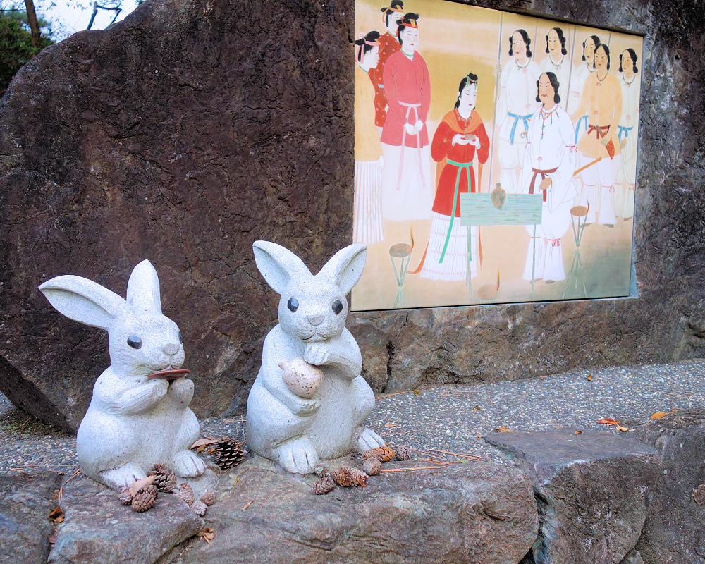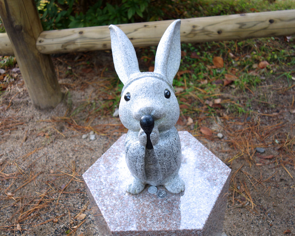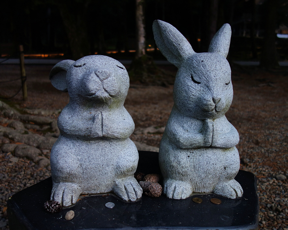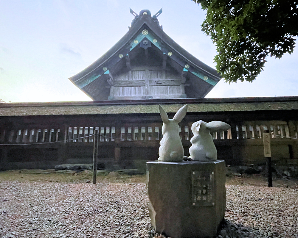 出雲大社の境内には、神話「因幡の白兎」にちなんだ、可愛らしい白兎の石像が数多く点在しています。