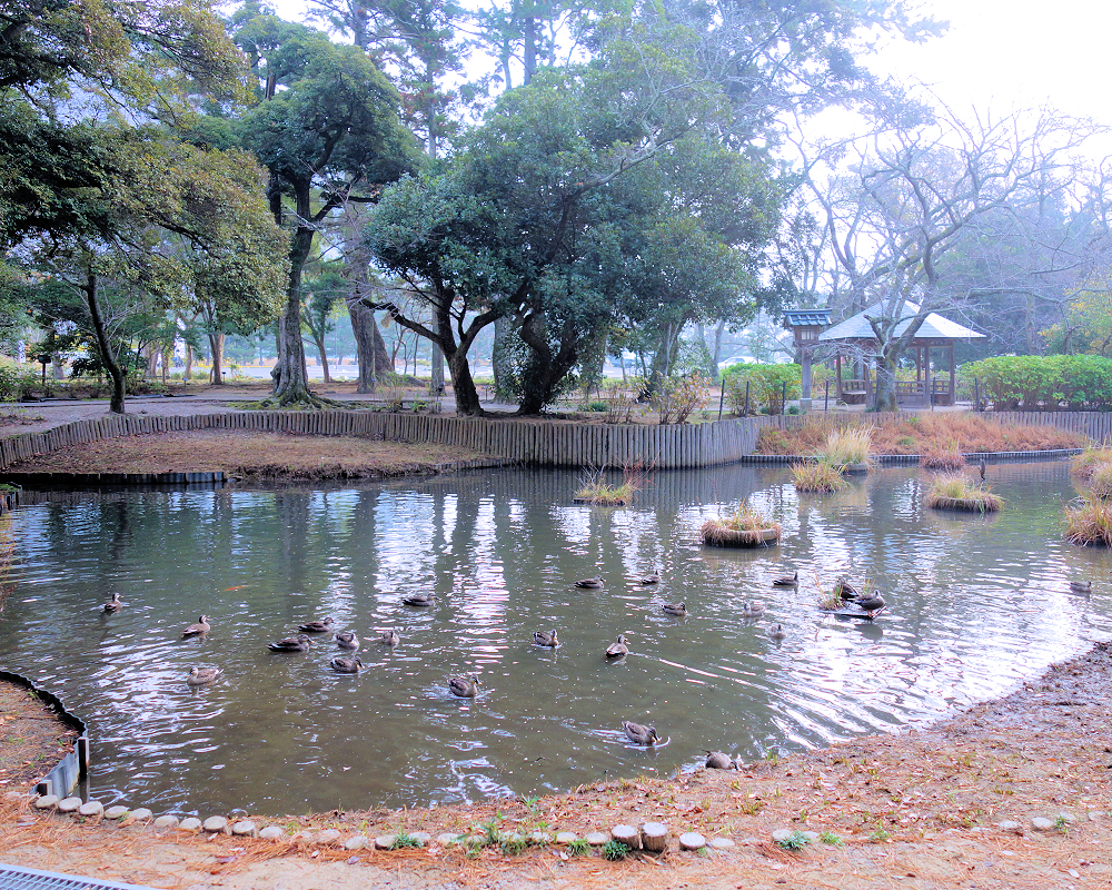 「さて、次の神社へ向かおう!」と「浄の池」のそばを通り過ぎようとした、その時です。多くのカモが気持ち良さそうに泳いでいたので、その姿を写真に収めようと池に近づきました。