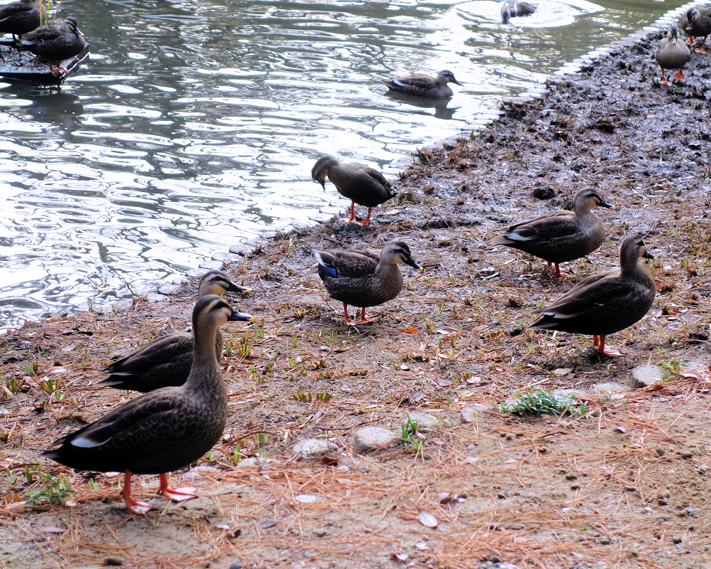 しばらく観察していると、なんと~カモたちが一斉に池から上がって来たのです。