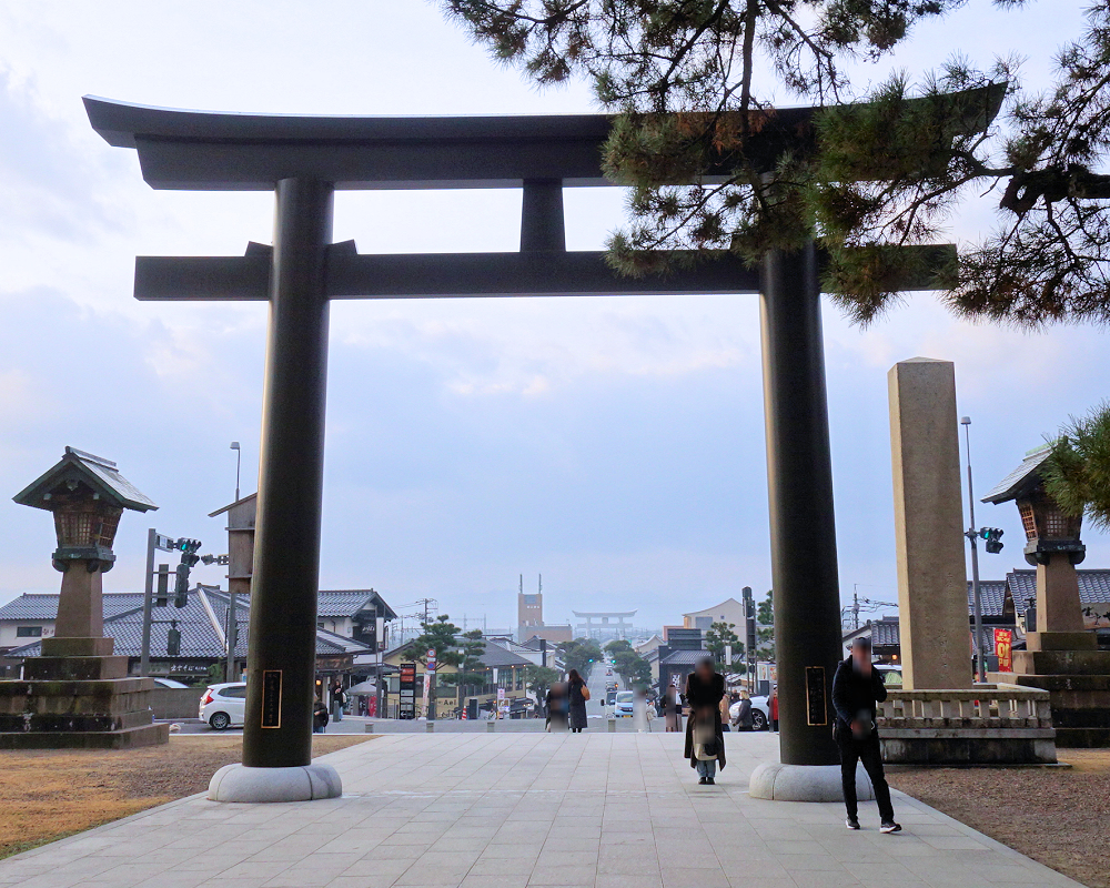 国の重要文化財にも指定されている風格ある鳥居で、長年の風雨により、独特の青緑色に変色しています。この鳥居をくぐると、いよいよ本格的な出雲参りが始まります。
