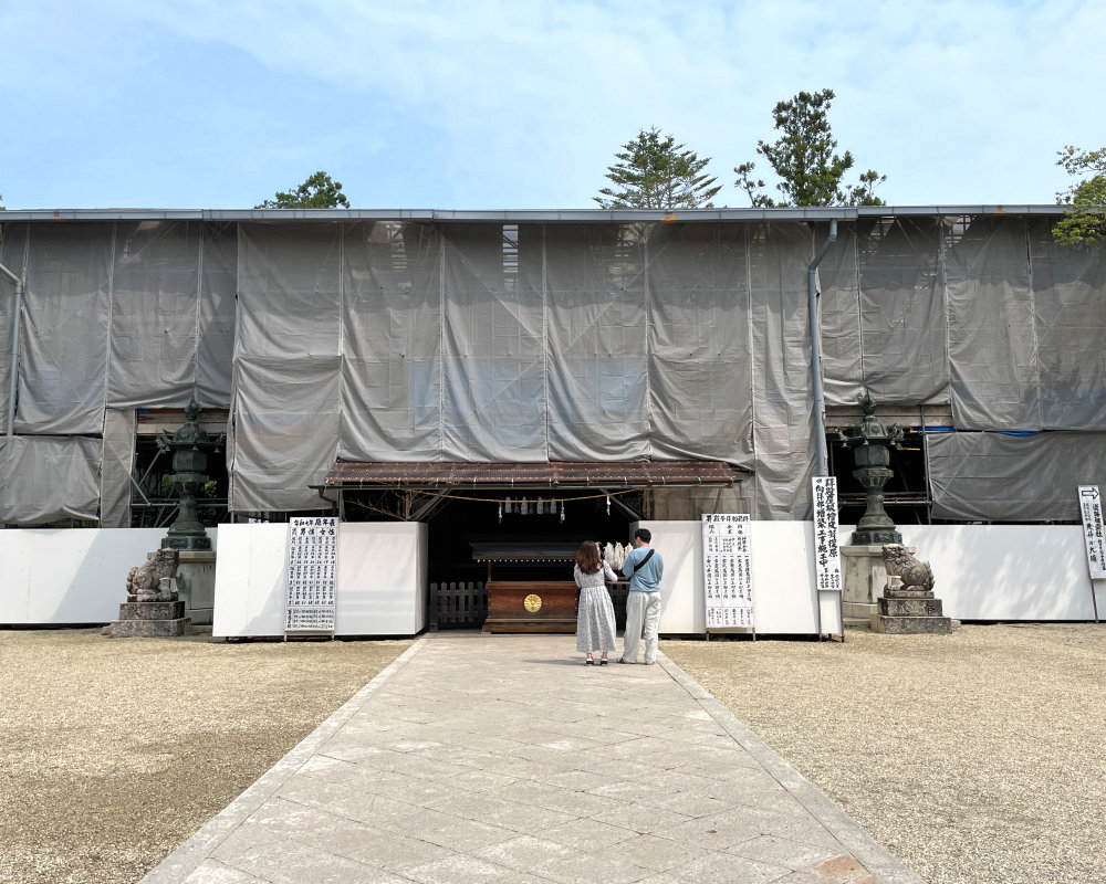 拝殿は入母屋造の建物で、かつては舞殿も兼ねていました。現在は改修され銅板葺の屋根となっています。私が訪れた時はちょうど修理中で、近くで見ることができなかったのが残念...。