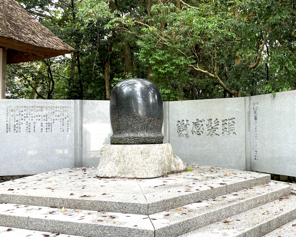 境内には「頭髪感謝碑」という石碑もあります。「髪(かみ)」と「神(かみ)」を重ね、髪に感謝する心を形にしたものです。2008年に育毛会社リーブ21の協力で建立されました。