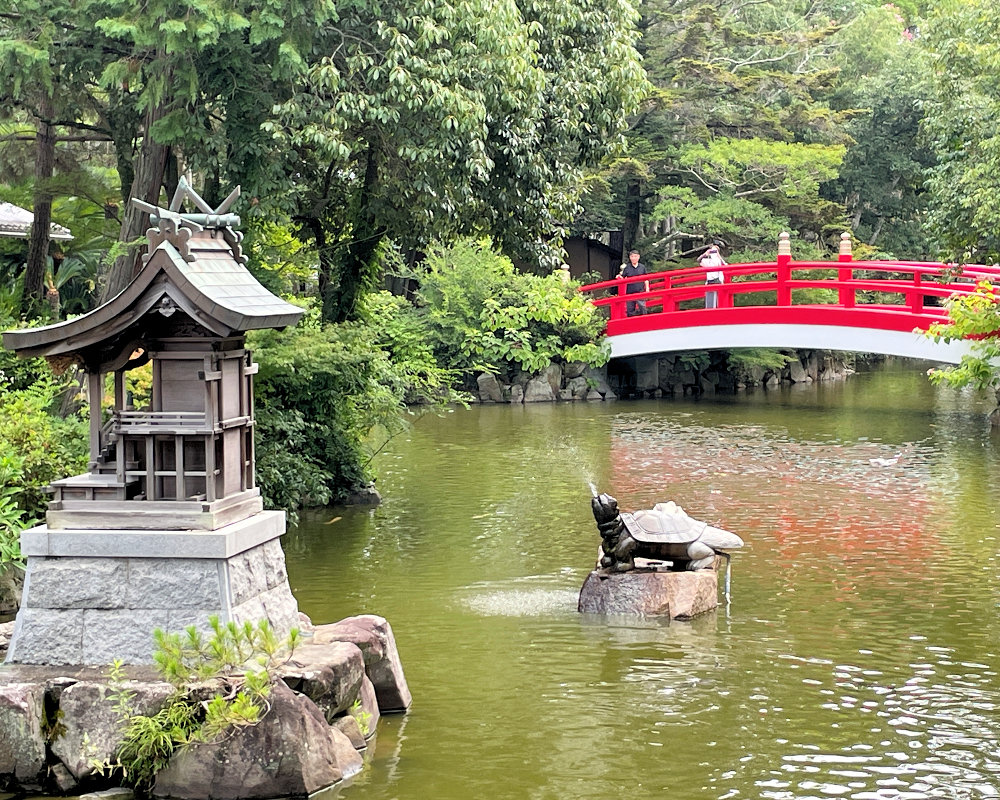 二の鳥居近くに広がる放生の神池は、かつて聖域を囲んでいた堀の名残。昔は病気平癒を願って鯉を、快癒の感謝に長寿を願って亀を放つ習わしがあったそうです。