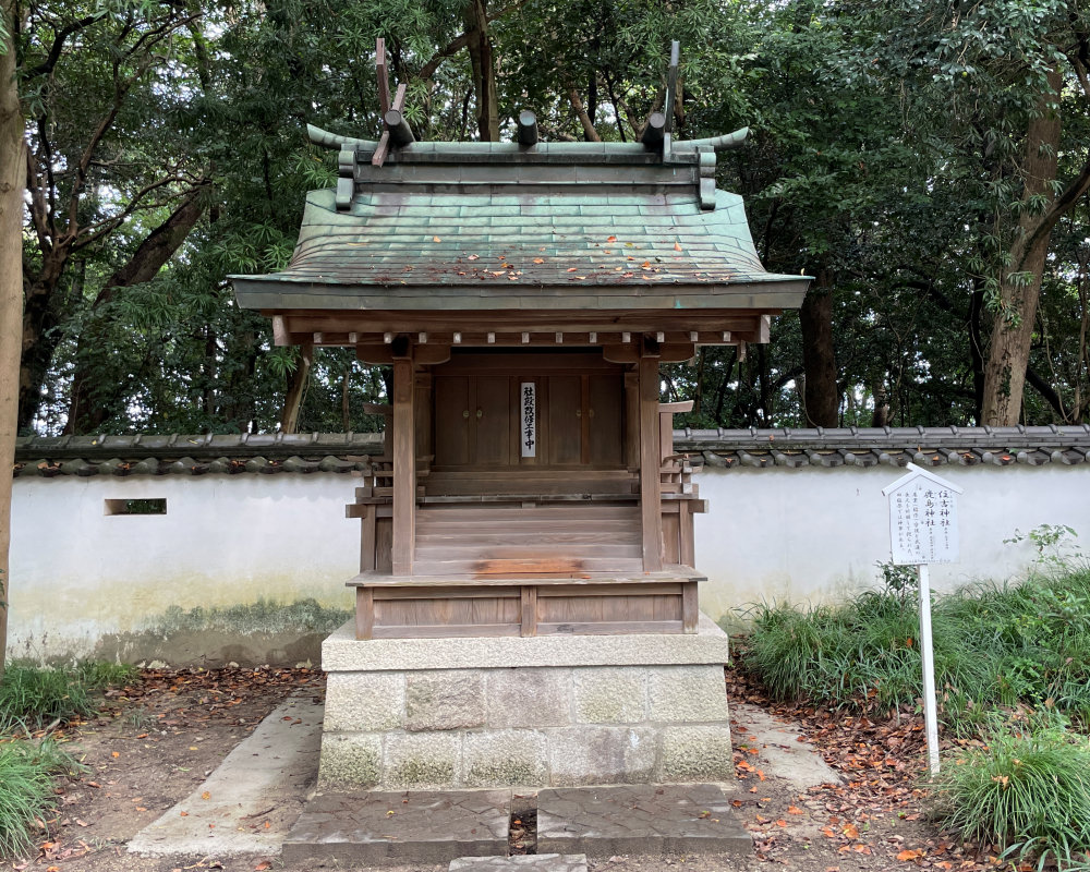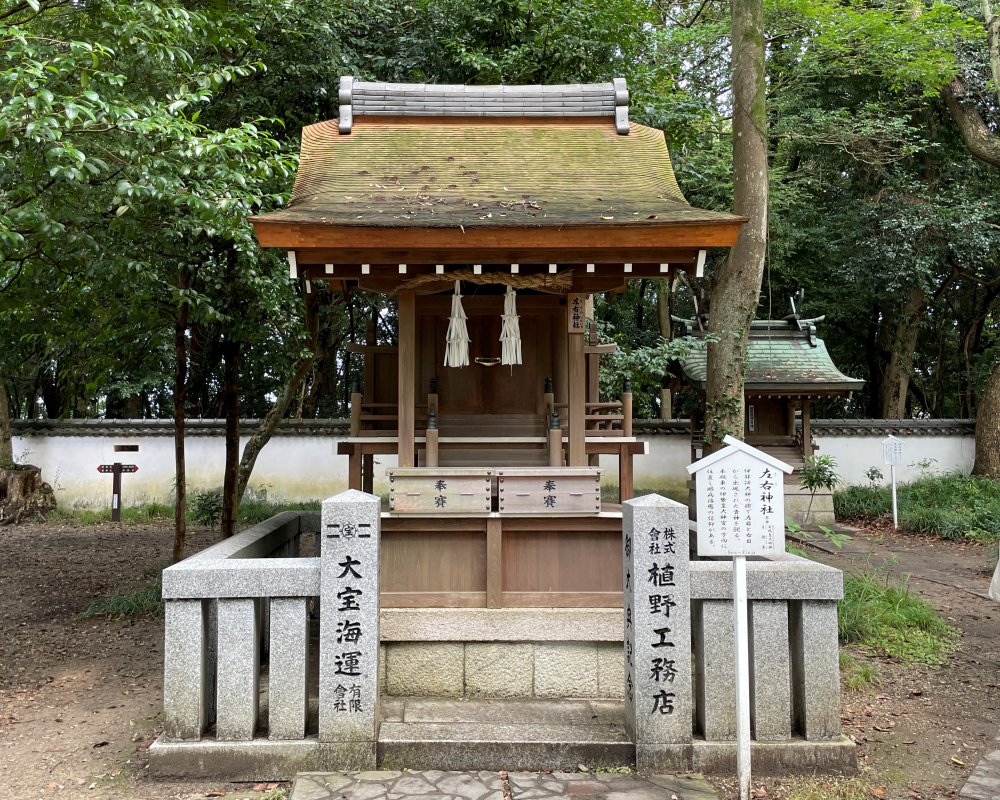 夫婦大楠の根元には小さな岩楠神社があります。こちらにはイザナギとイザナミの間に最初に生まれた神さま、「蛭子大神」が祀られています。