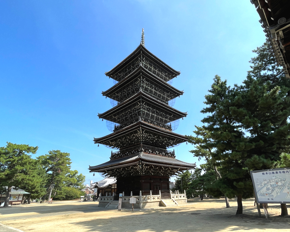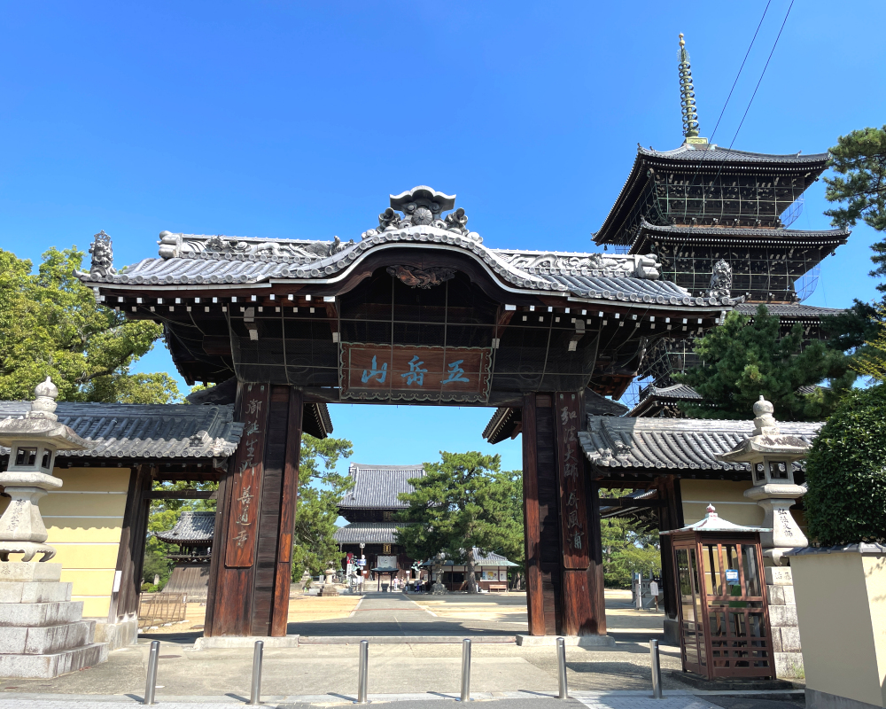 善通寺のシンボルともいえる五重塔は、高さ43メートルを誇ります。日本の木造塔としては、京都の東寺・奈良の興福寺に次ぐ規模で、その大きさと存在感は圧巻。