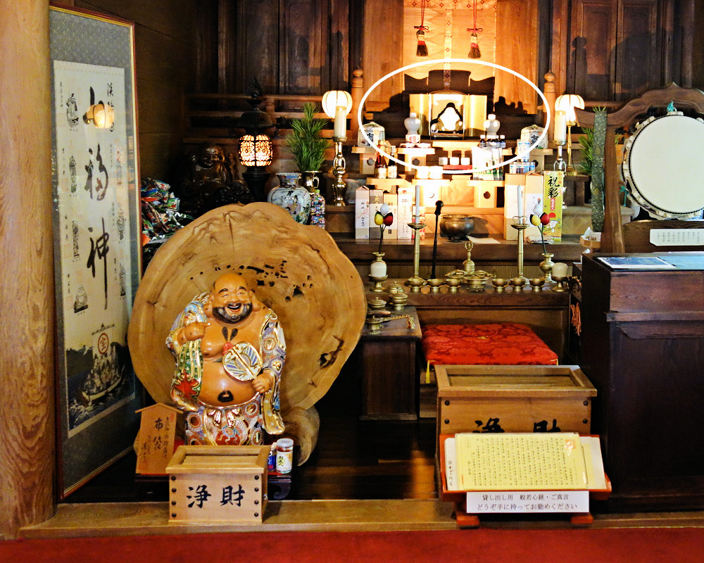 淡路島七福神めぐりでは、「ハッピー券」を申し込むと、各お寺でご祈祷を受けることができます。護国寺でも、布袋尊に手を合わせ、ご縁と笑顔を願うお参りを体験できます。
