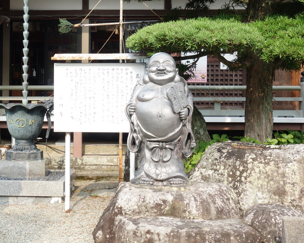 参道を進むと、堂々とした本堂が見えてきます。その前には、丸いお腹と優しい笑顔が印象的な布袋尊像が立っています。