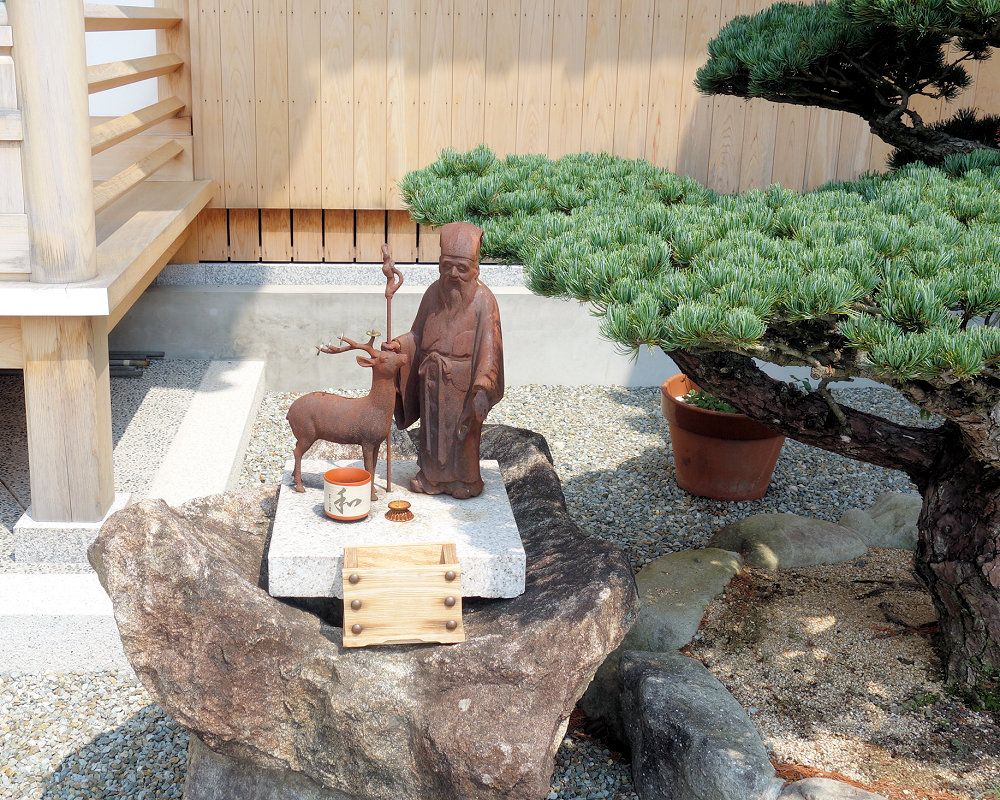 長い頭と白い髭が印象的な寿老人は、右手に宝杖、左手に桃を持ち、そばには長寿の象徴・鹿を従えています。