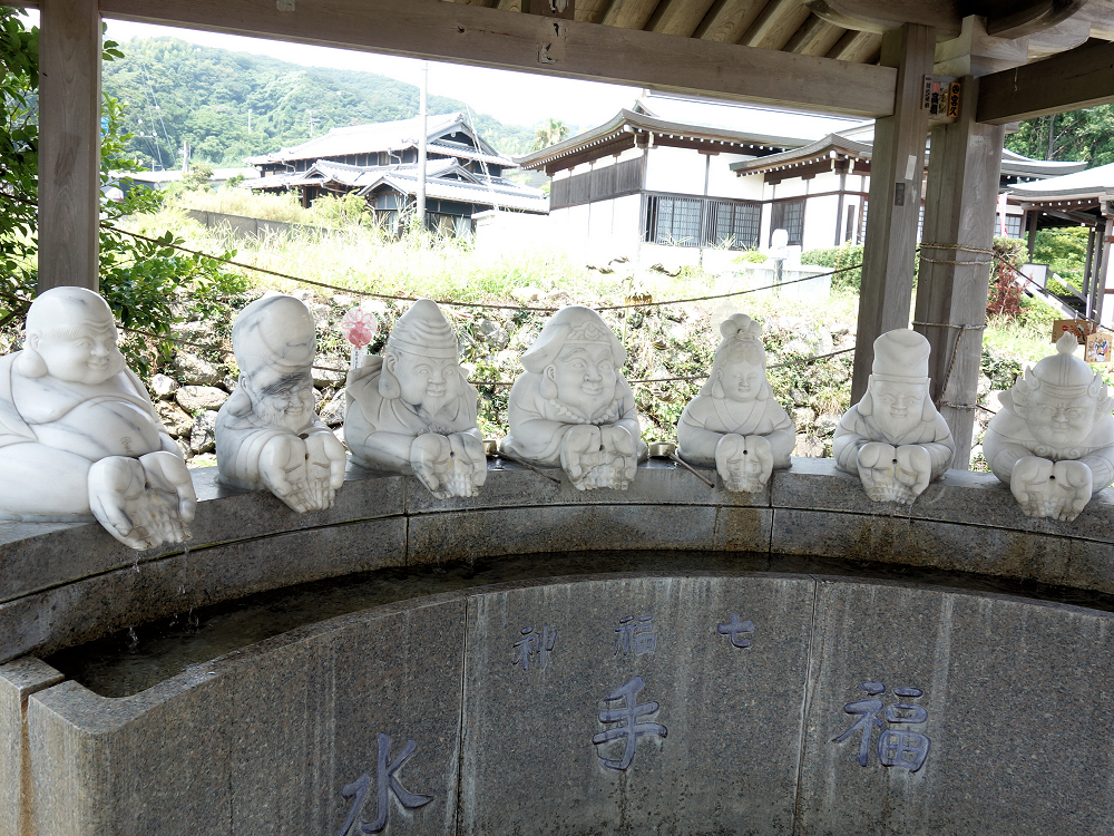 手水舎には七福神の像が並び、それぞれの手のひらから清めの水が流れ出すという珍しいデザインになっています。