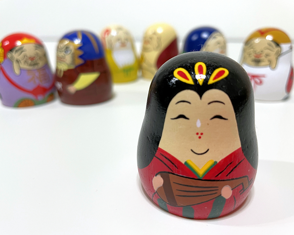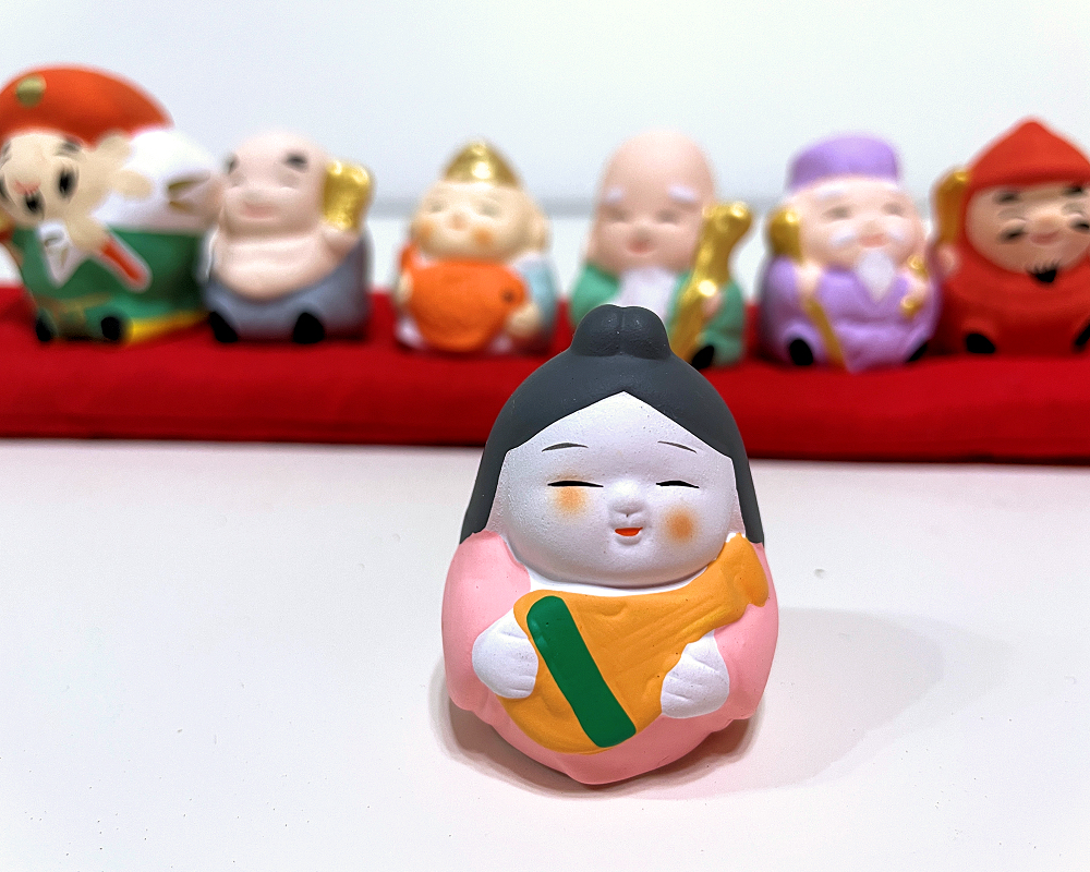 七福神の中で唯一の女性の神さま。もとはインドの水の女神・サラスヴァティーで、水の流れから音楽や芸術、知恵を司る女神として信仰されてきました。やがて豊かな水が恵みをもたらすことから、福徳や財運の神さまとしても親しまれるようになります。