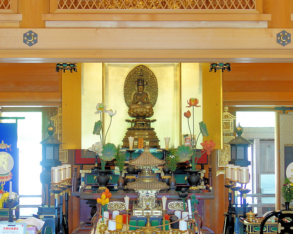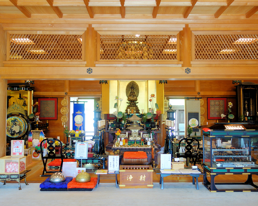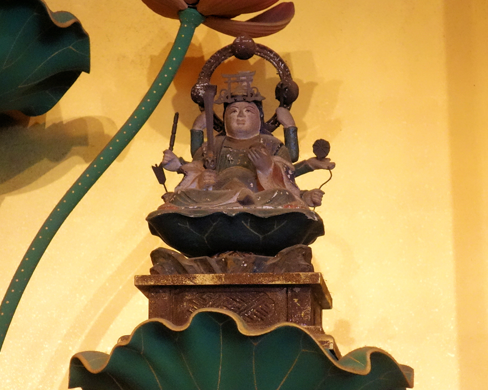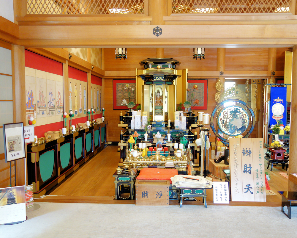 本堂の中は広く、内陣にはご本尊の大日如来坐像をはじめ、八本の手を持つ八臂弁財天像や地蔵菩薩像などが並びます。