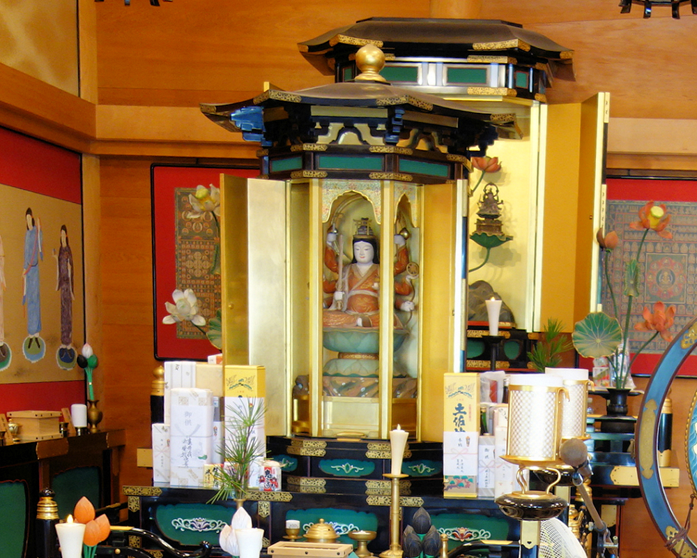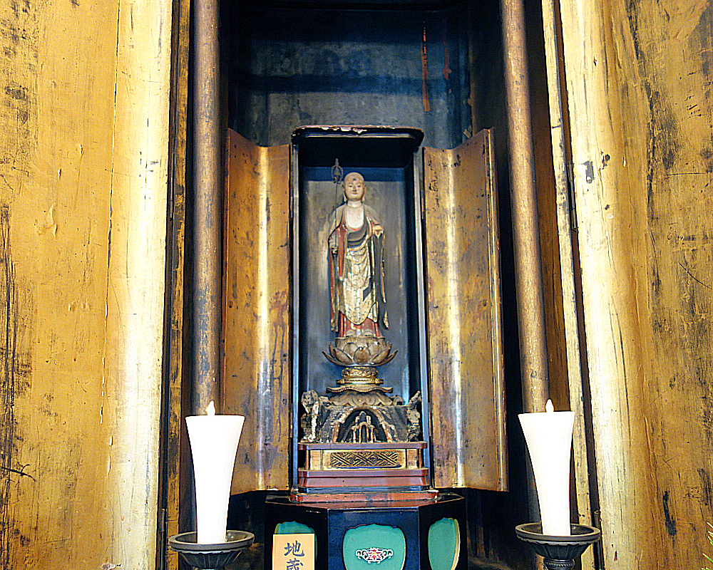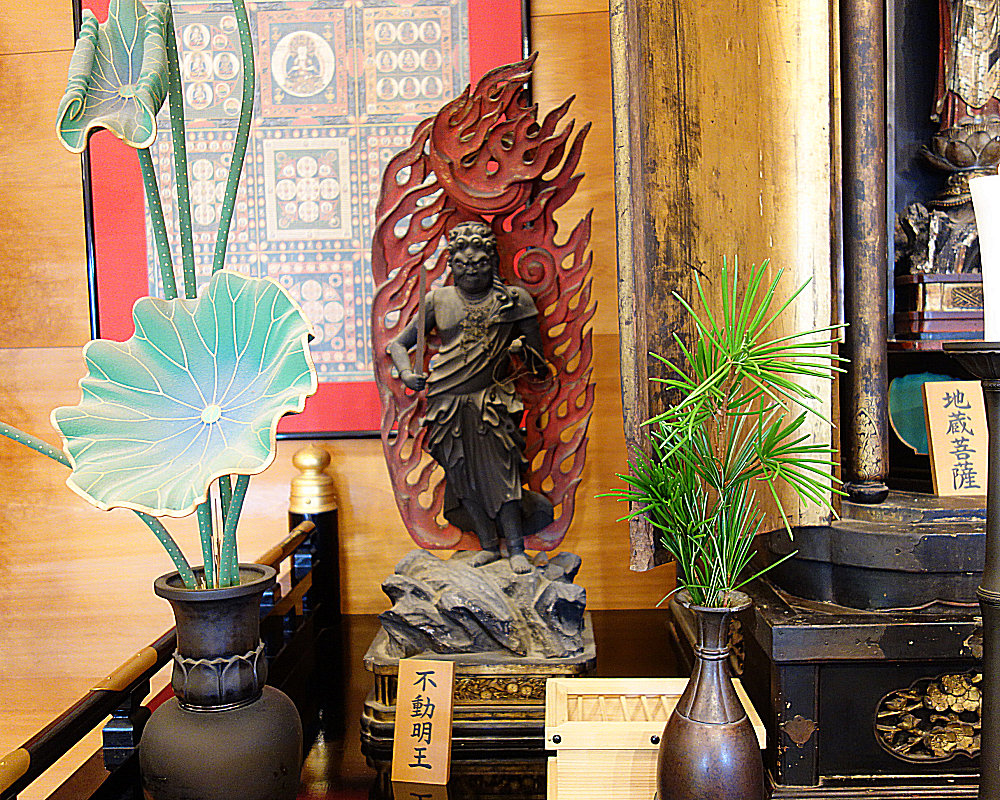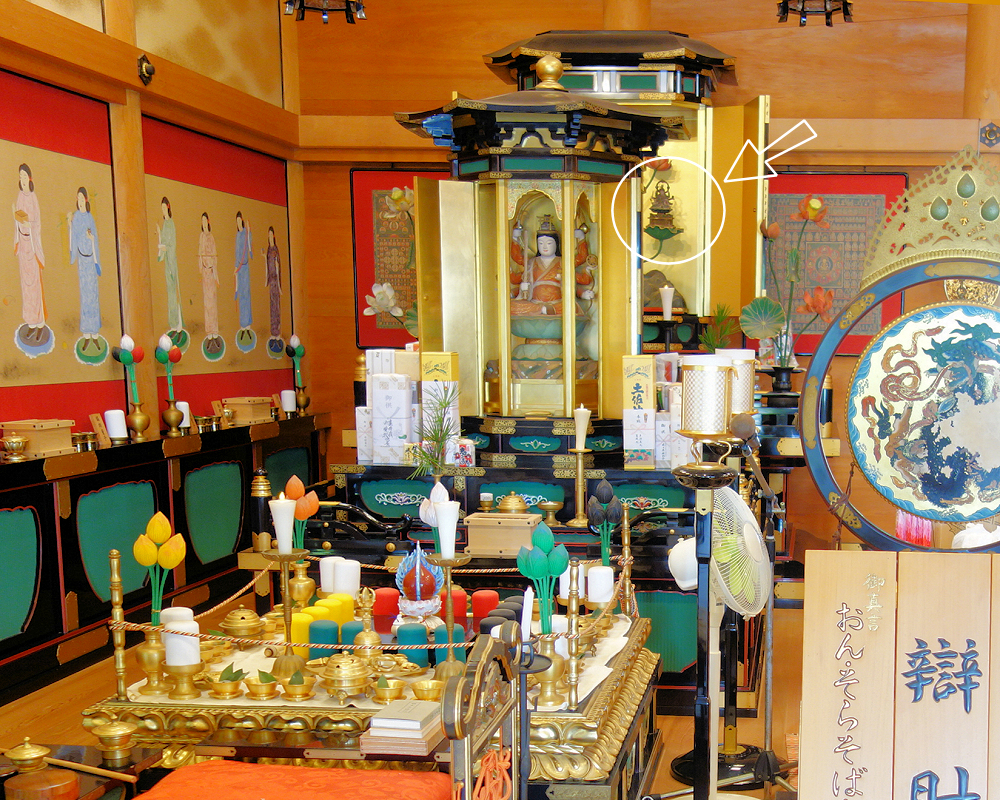 本堂の中は広く、内陣にはご本尊の大日如来坐像をはじめ、八本の手を持つ八臂弁財天像や地蔵菩薩像などが並びます。