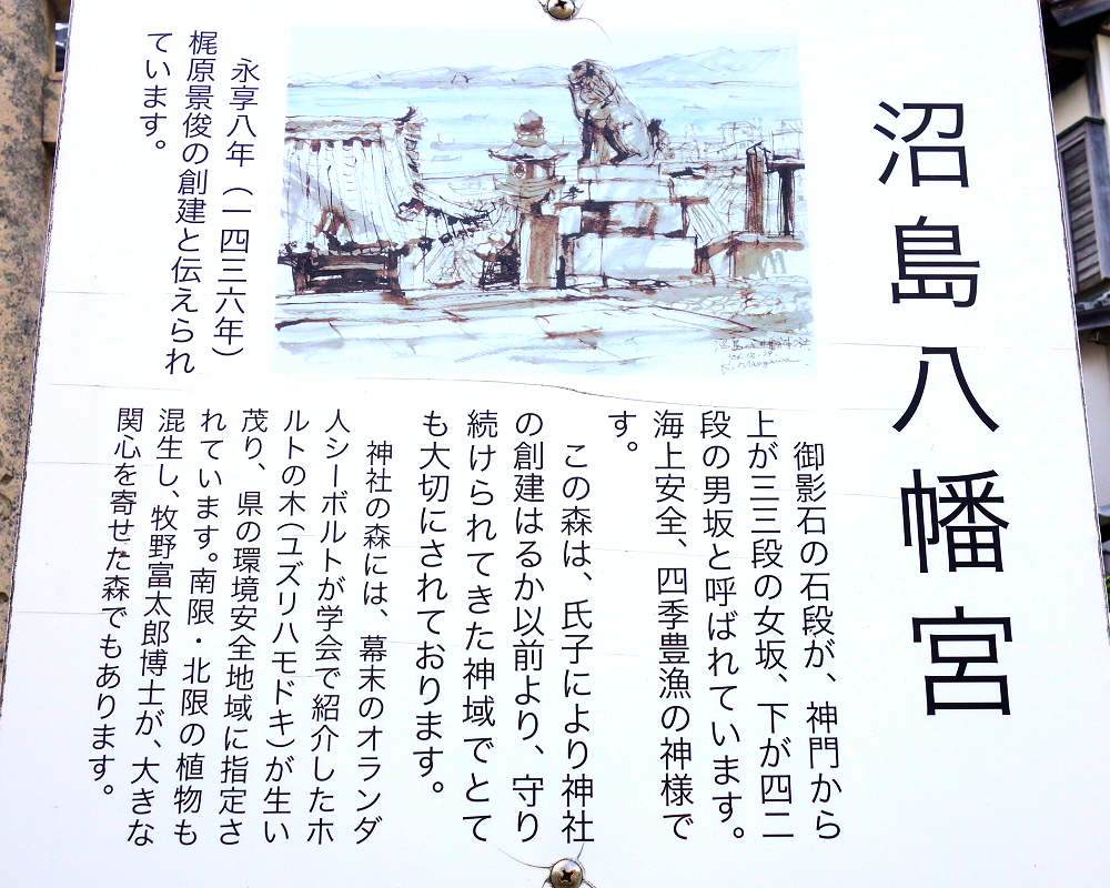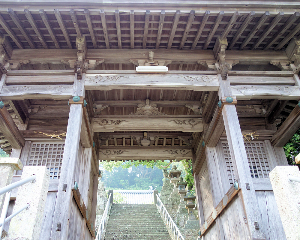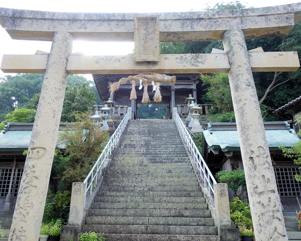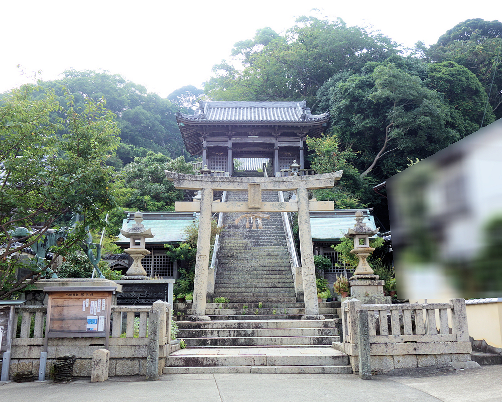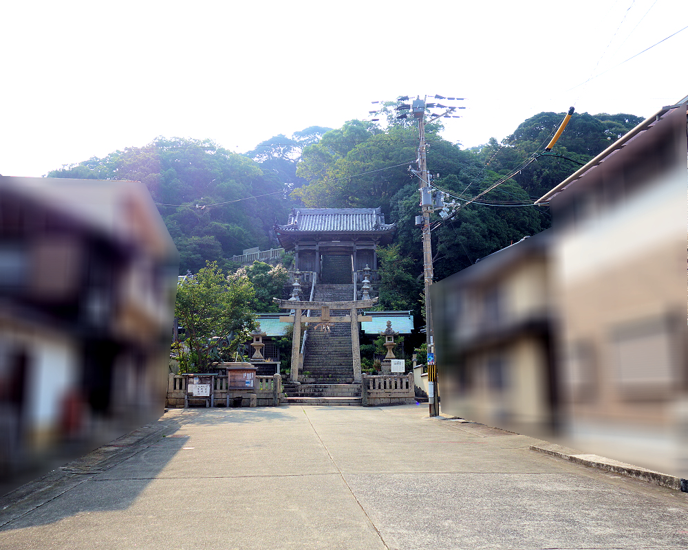 沼島港に着いて、島の道を5分ほど歩くと、奥まった場所に【沼島八幡宮】の鳥居と石段が見えてきました。