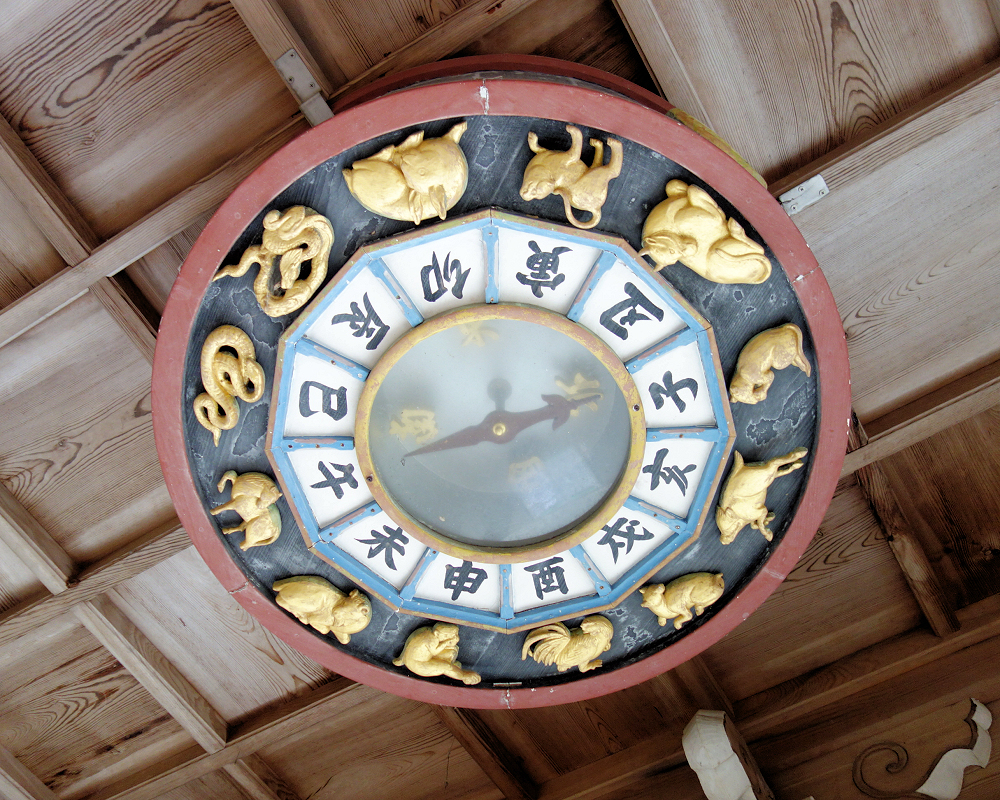 拝殿の天井を見上げると、珍しい羅針盤が掛けられていました。これは「逆羅針盤」と呼ばれる方位磁石で、十二支の方位を示すように描かれています。