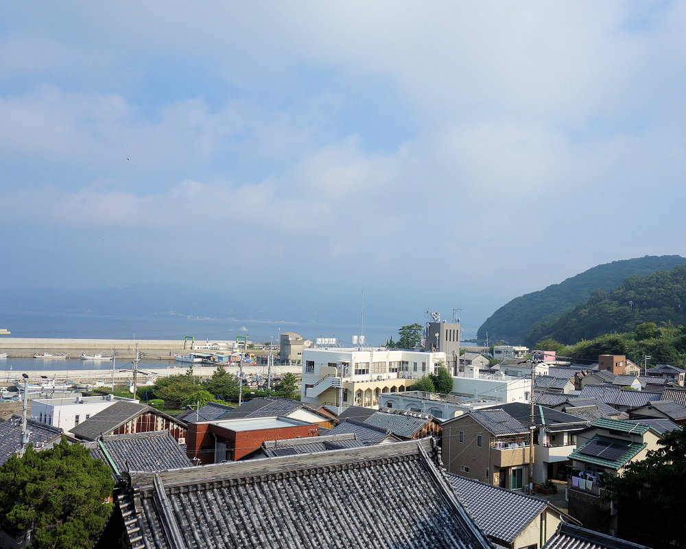 拝殿から見下ろす港と海。柔らかな光に包まれた沼島の風景が、とても穏やかでした。