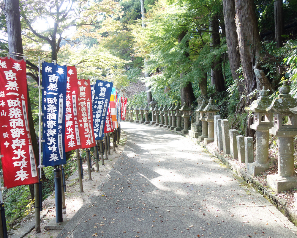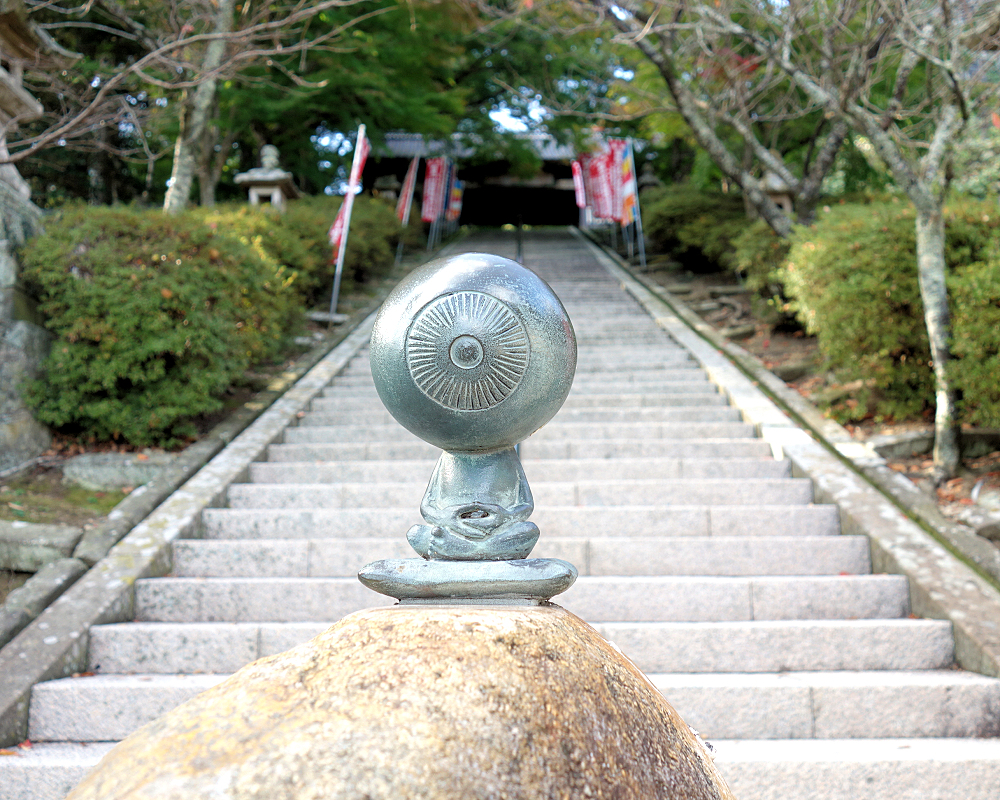 駐車場から本堂までは10分ほど歩きます。参道の途中には、門前商店や百八基の石灯籠、そしてかわいらしい目玉おやじの像など、見どころが点在。歩きながらゆっくりと風景を楽しめる、心地よい参道です。