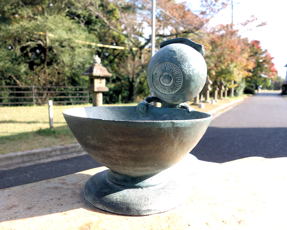 参道には鬼太郎の「目玉おやじ」像もあり、その可愛らしさについ笑顔に。お参りのあとに境内のお茶席でいただく温かいお茶も格別で、心までほっと和みます。