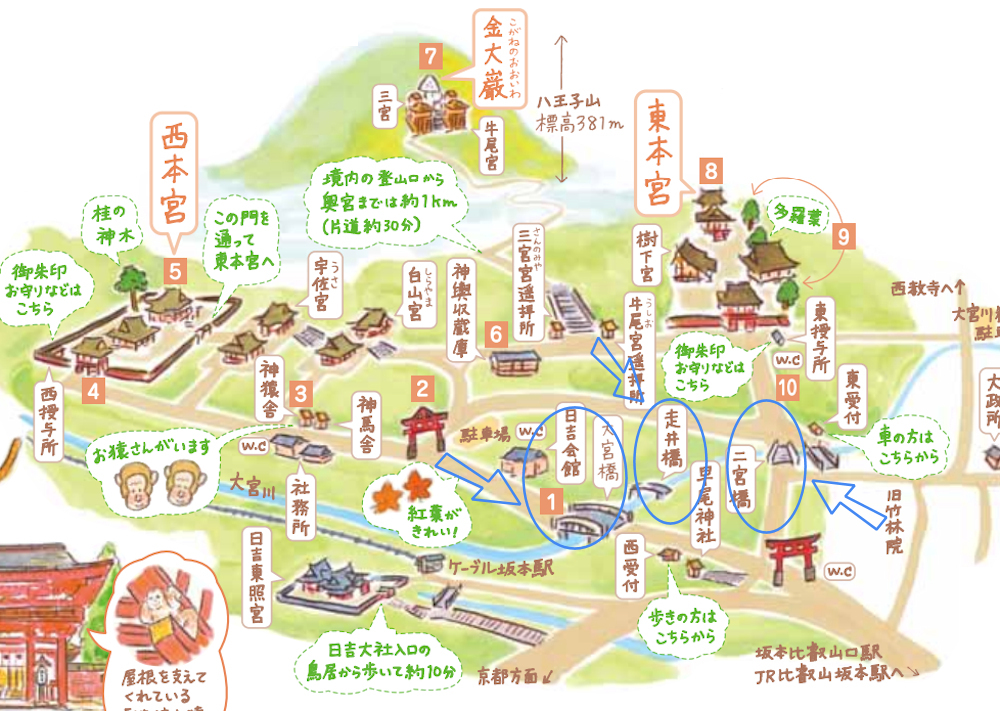 日吉大社の境内は、主に「西本宮」と「東本宮」の二つのエリアに分かれています。