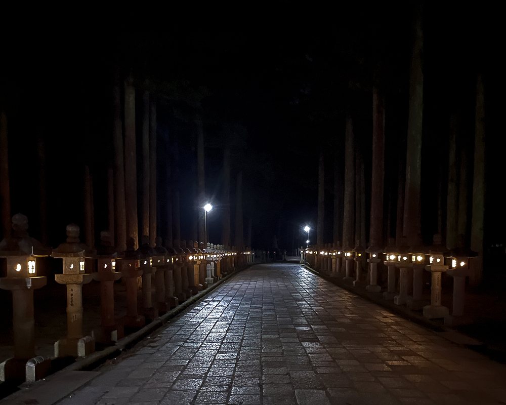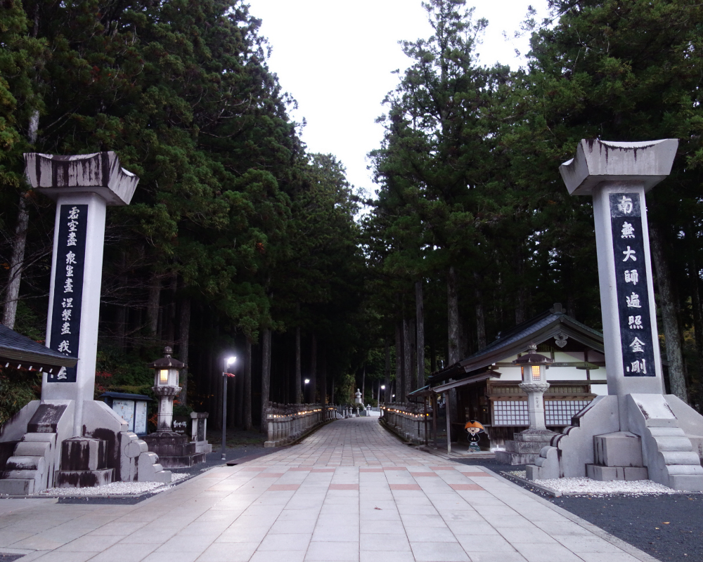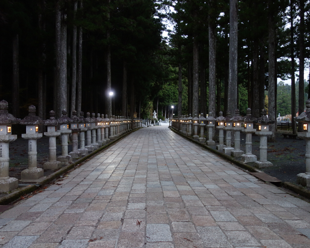 明け方の奥之院はまだ闇の中で、入口から燈籠堂までは静かな墓所の道を進みます。