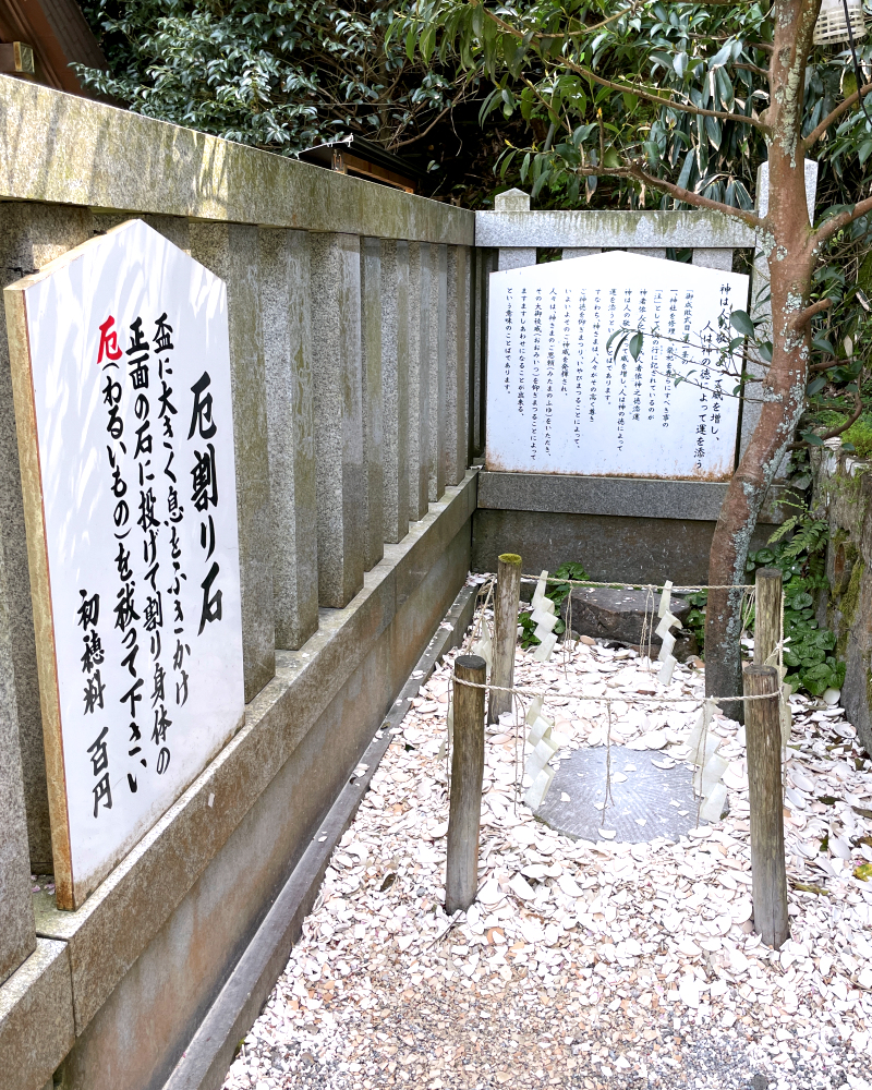 盃に息を吹き掛け、厄割り石をめがけて投げ割り、厄落としをします。盃に息を吹きかけ自分の厄を盃にうつし、それを割る事で厄が落ちるとされています👏
