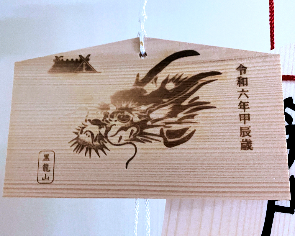 【毛谷黒龍神社】識子さん紹介の縁起物(絵馬とくろたつ最中)