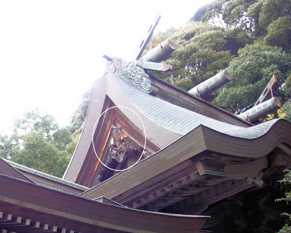 創建は継体天皇8年(513年)と伝わりますが、その後、石見銀山を巡る戦いの影響などで三度焼失しました。この歴史から、「亀は水を呼ぶ」といわれ火災を避ける願いが込められ、屋根の千木の真下には、子どもの背丈ほどもある大きな亀の彫刻が施されています。