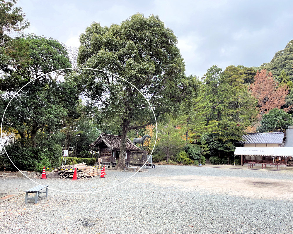 社殿前方の、表参道沿いに位置する左側のエリアです。ここには大きなムクノキがあり、周囲を木々に囲まれたような、不思議な雰囲気を持つ空間となっています。
