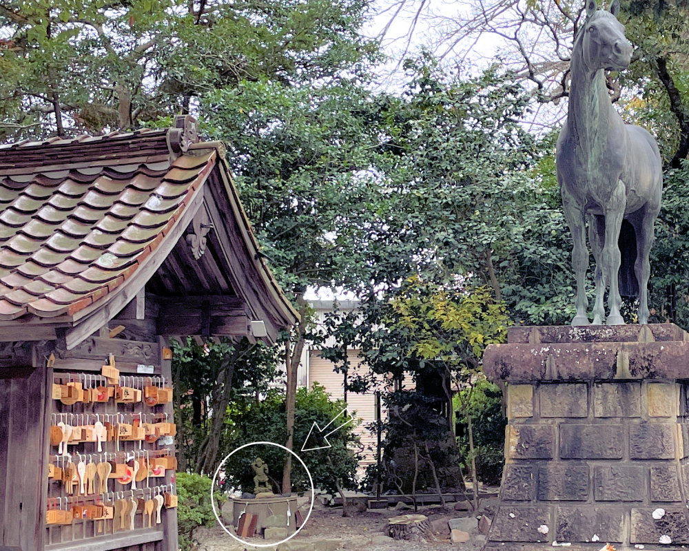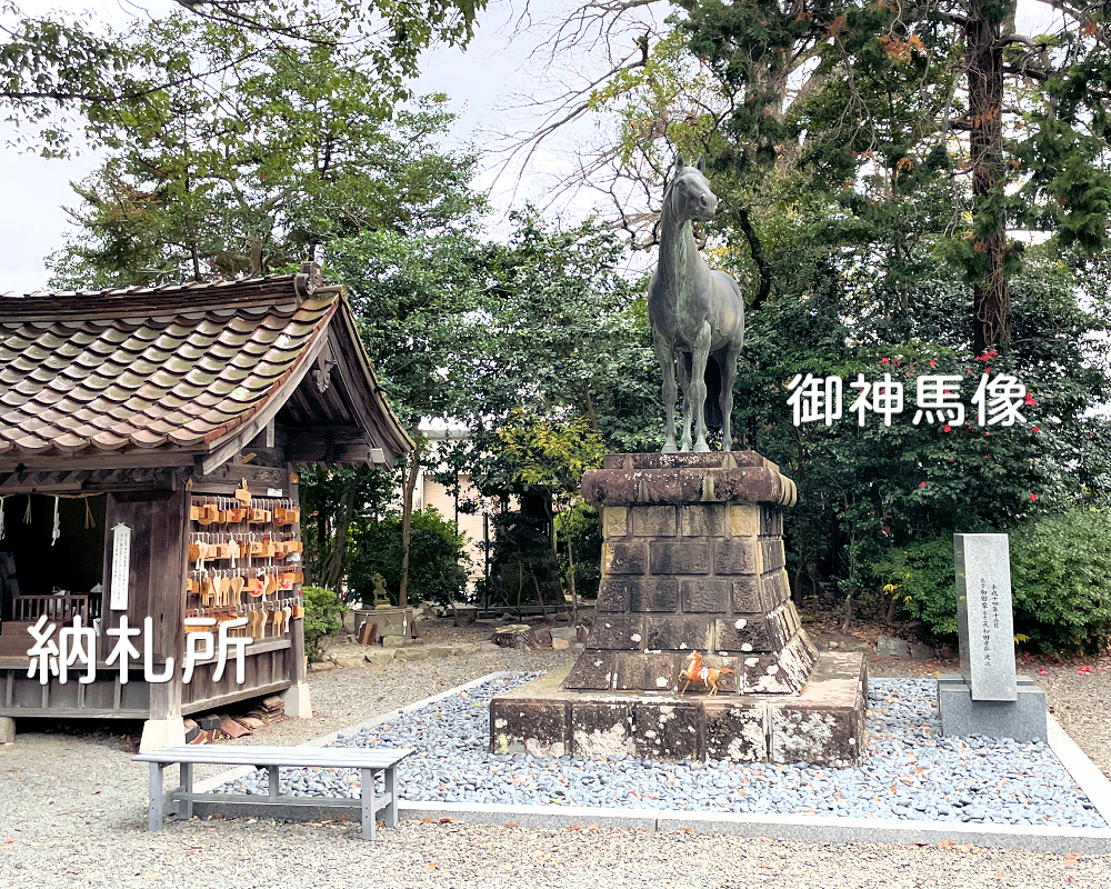 七冠馬シンボリルドルフの父馬であり、その血統で一時代を築いたサラブレッド「パーソロン号」が御神馬像のモデルとなっています。競馬ファンがよく訪れることから、御神馬像の前には、参拝者が供えた野菜や果物などが置かれていることもあるようです。