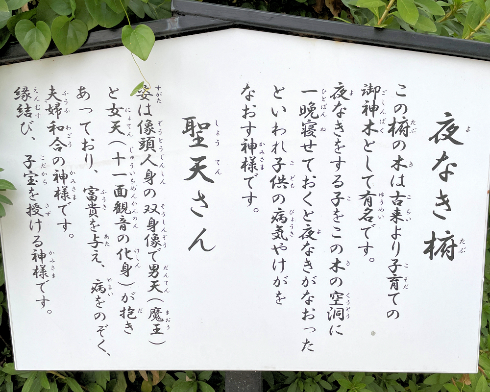 その「夜なき椨」の空洞の中には、縁結び・安産の神とされる大聖歓喜天がお祀りされています。いただける御神徳は、子どもの病気平癒、夫婦和合、縁結び、子宝授けなど多岐にわたります。