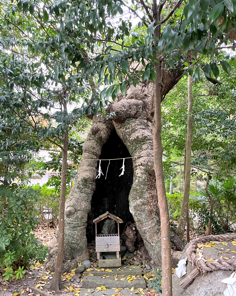 古来より子育ての御神木として有名な「夜なき椨(たぶ)」は、夜泣きをする子どもをこの木の空洞に一晩寝かせておくと、夜泣きが治ると伝えられています。