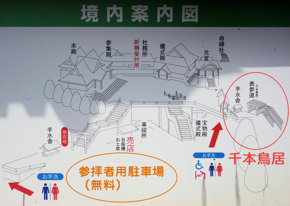 千本鳥居の周辺には駐車場がありません。そのため、車で参拝する場合は、本殿近くの参拝者用駐車場(無料)に停めるか、町内の有料駐車場を利用することになります。