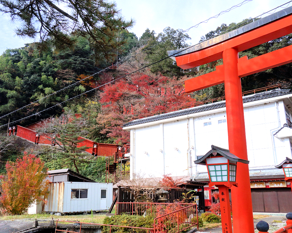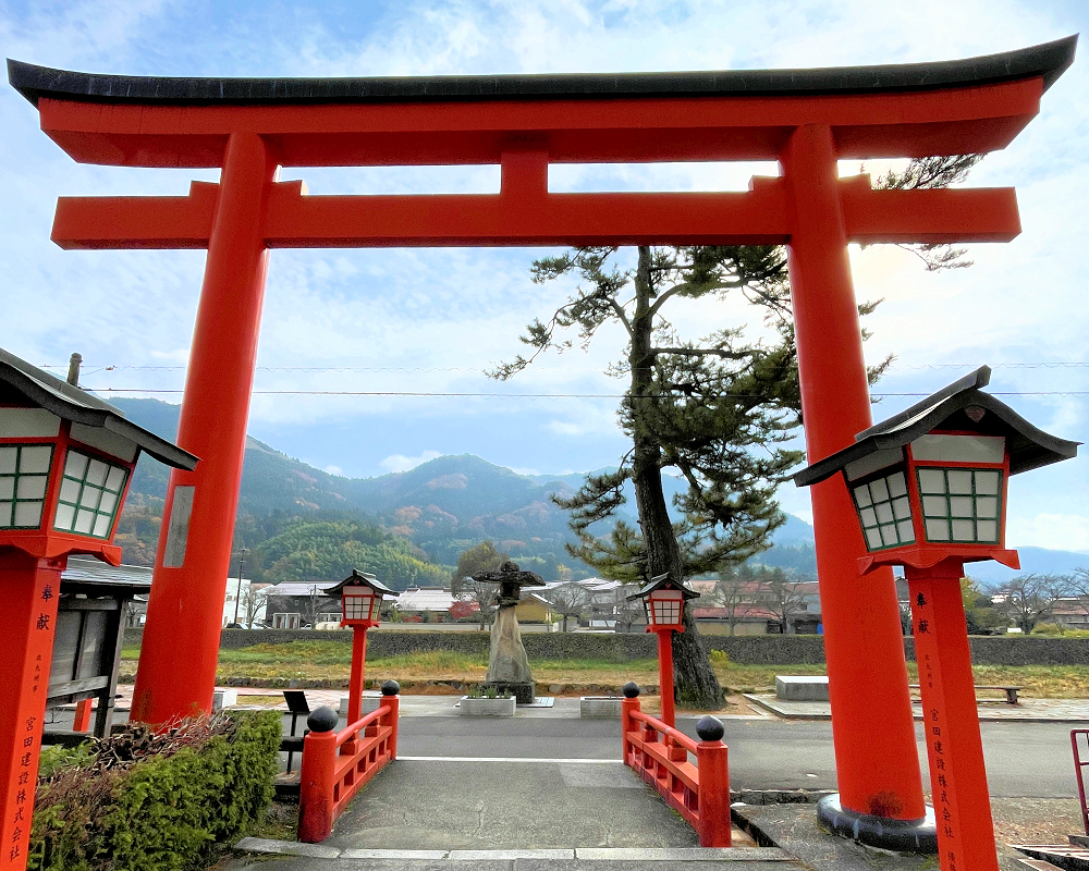 川沿いに穏やかな町並みが続き、山々の緑や紅葉がふんわり混ざり合っていて、その柔らかな風景の中に、表参道の大鳥居がすっと立っていました⛩✨