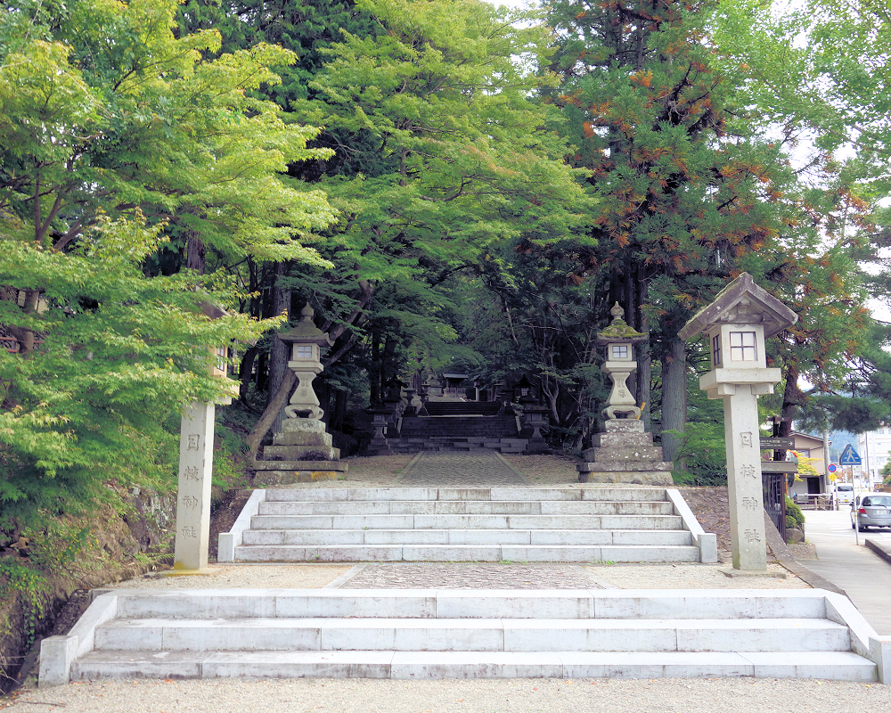 境内は城山の斜面に沿って奥へと延びています。石段を上りながら社殿へ向かいます。