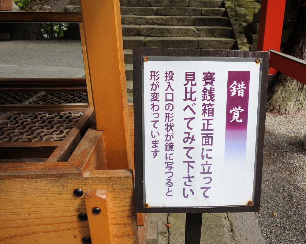 二の鳥居の手前にあるお賽銭箱には、飛騨の匠が仕掛けた面白い演出があります。表面の「なみなみ模様」を正面の鏡に写して覗き込むと、不思議なことに真っすぐな線に見える目の錯覚を楽しめます。