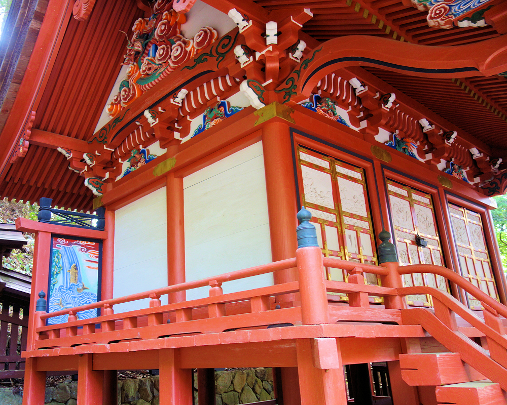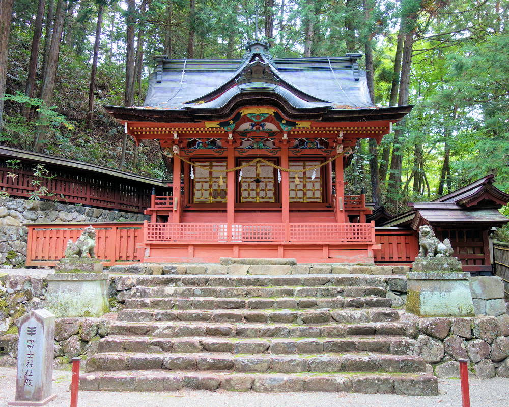 拝殿の右側に位置する富士社社殿は、境内でもひときわ目を引く「極彩色」の美しさが特徴です。