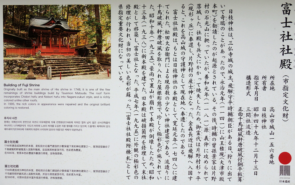 戦国時代末期、飛騨国を平定した金森氏が高山城を築城するにあたり、神社は現在の城山へ遷されました。以後、日枝神社は高山城の鎮守として篤く崇敬され、城と城下町を守る重要な存在となります。