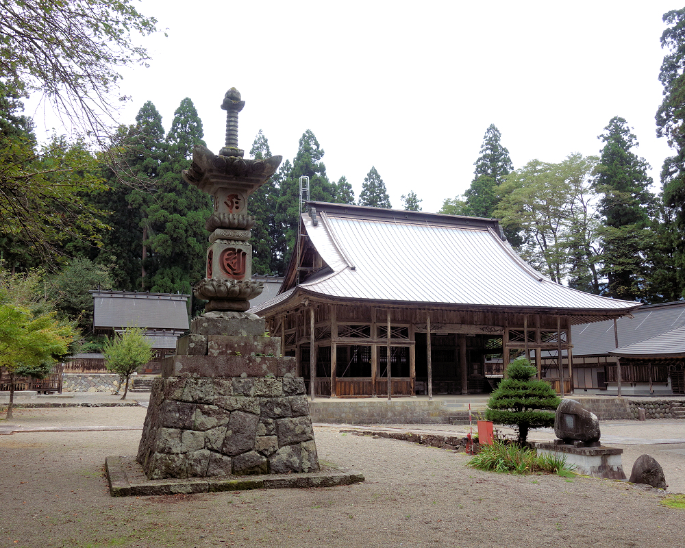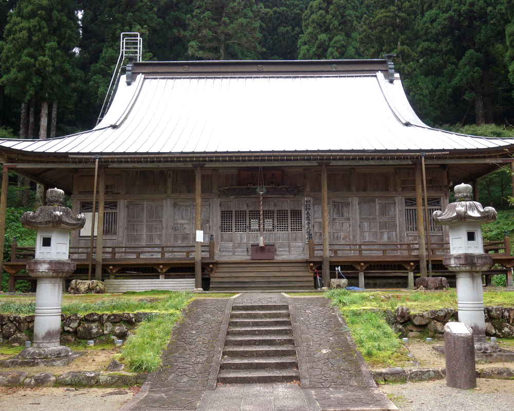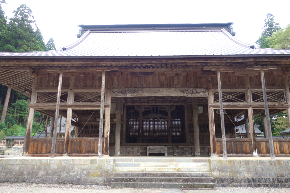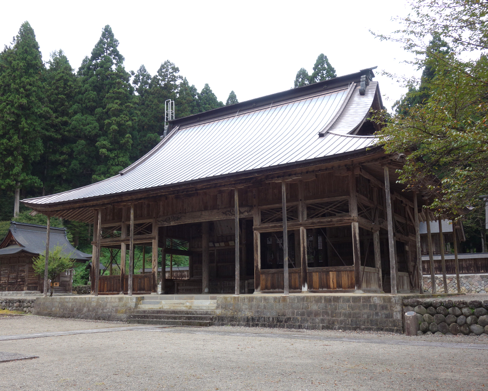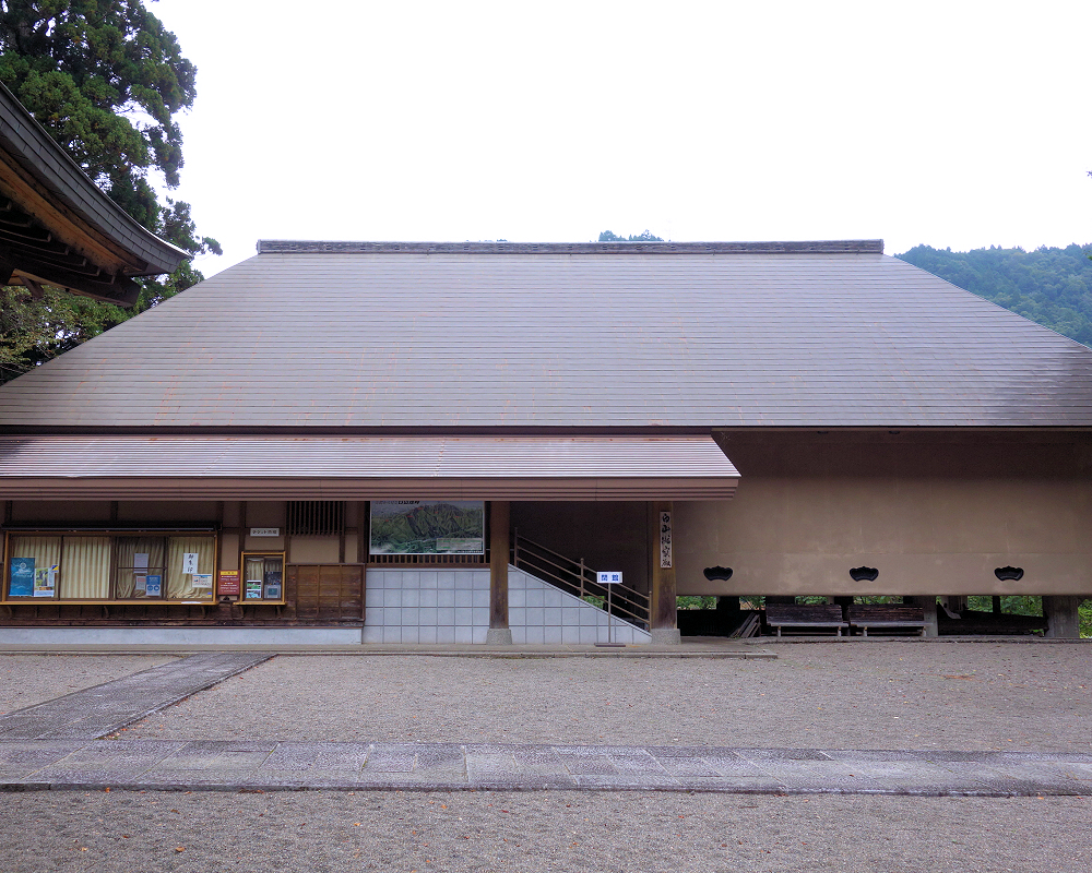 白山中宮長瀧寺の大講堂は1910年に再建された木造建築で、白山三山の本地仏である釈迦・阿弥陀・薬師の三尊像を安置しています。