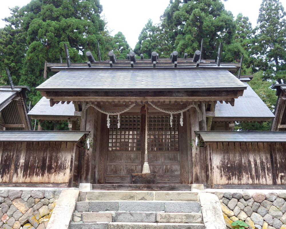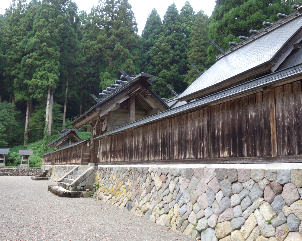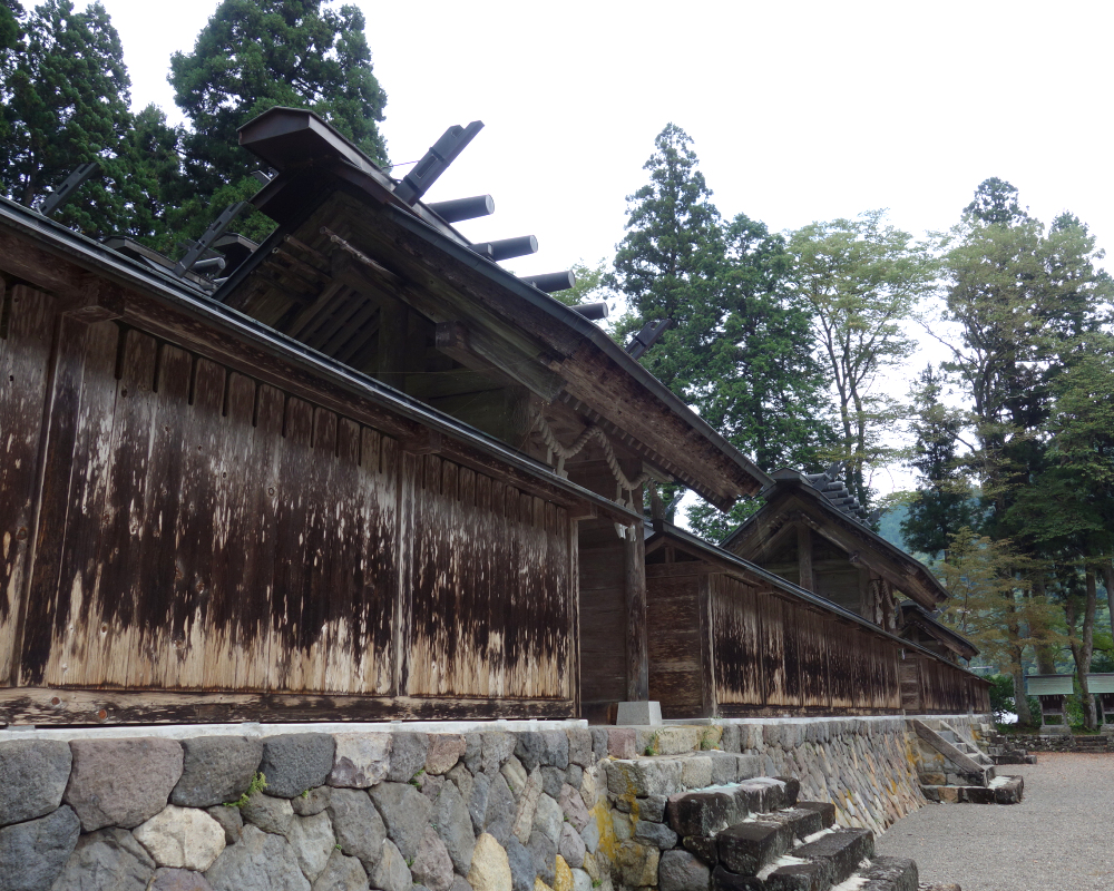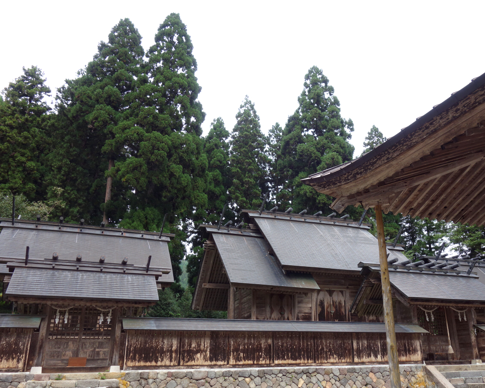本殿は、拝殿のさらに奥、一段高い石垣の上に三つの社殿が独立して並び立つ形式をとっています。これは霊峰・白山の三つの主要な峰(御前峰・別山・大汝峰)を神格化したものです。