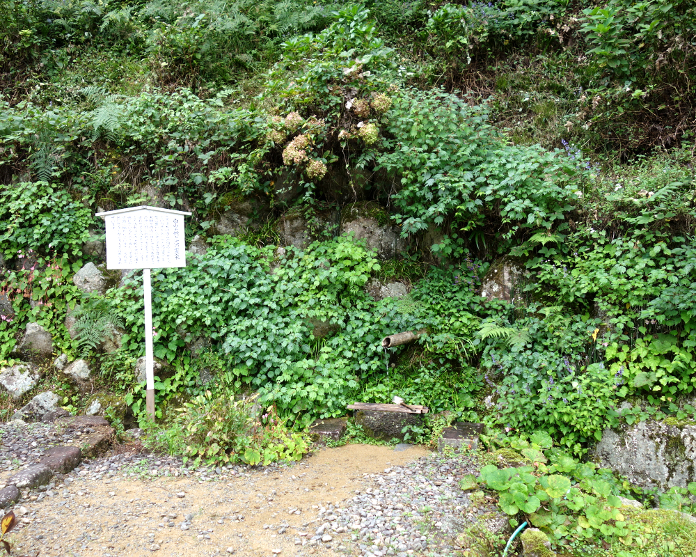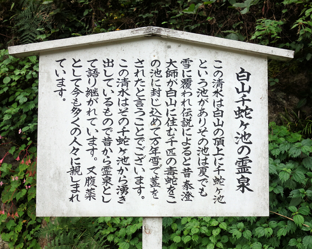 この水は、白山の頂上にある「千蛇ヶ池」から湧き出していると伝えられています。伝説によると、昔、白山を開山した泰澄大師が、山に住む千匹の毒蛇をこの池に封じ込め、万年雪で蓋をしたとされています。この霊泉は、その神聖な池から流れ出た水であると語り継がれてきました。