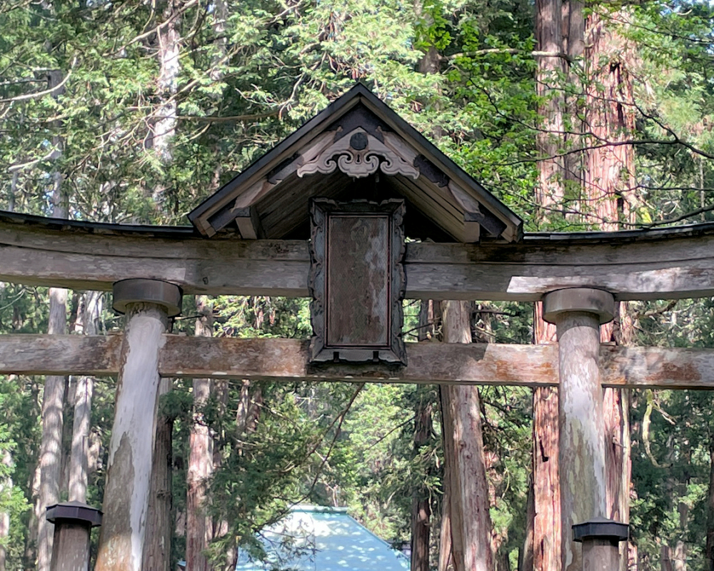 中央に掲げられた扁額には「白山三所大権現」と記されています。これは中御門天皇の皇子であり、天台座主も務めた公遵法親王の筆によるものと伝えられる貴重なものです。鳥居の中央に小さな屋根がついているのは、この大切な額を雨風から護るため。