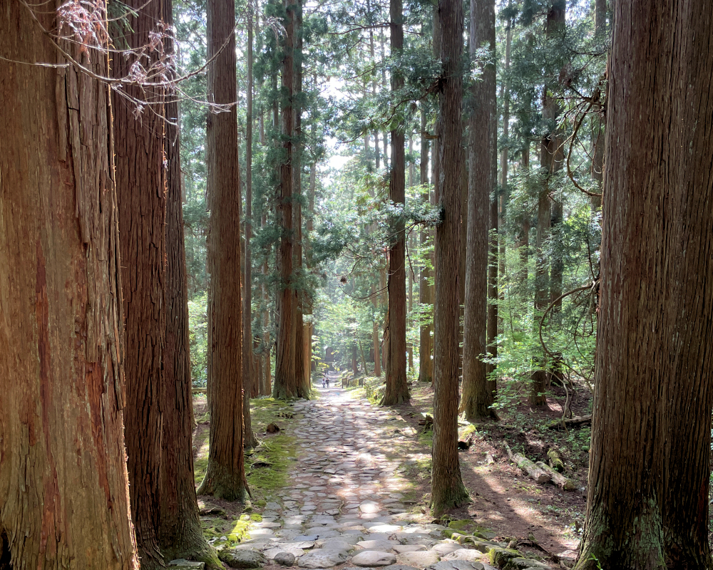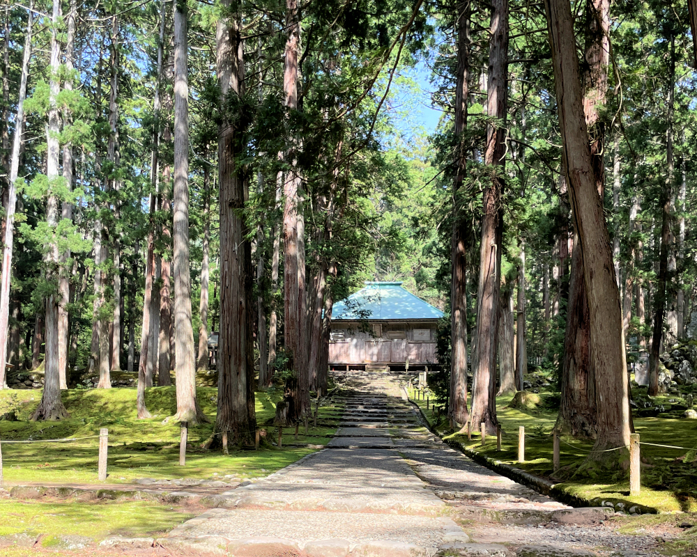 かつては白山信仰の越前側拠点として、日本最大級の宗教都市を形成するほど隆盛を極めました。現在は、一歩足を踏み入れると、一面を覆う深緑の苔と天高く伸びる杉木立が織りなす、静謐で幻想的な光景が広がっています。