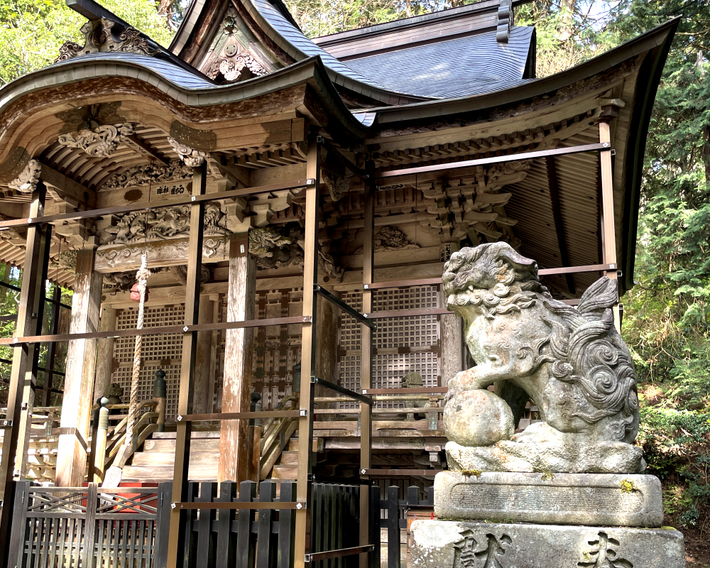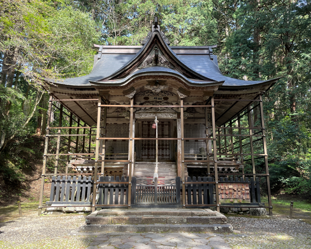 御本尊を中心に、右に「別山社」、左に「越南知社(おおなむちしゃ)」が配置されているのは、白山を構成する三つの山と神々を表現したものです。かつてはさらに二社が加わり、五つの社が整然と立ち並ぶ壮観な景色が広がっていました。