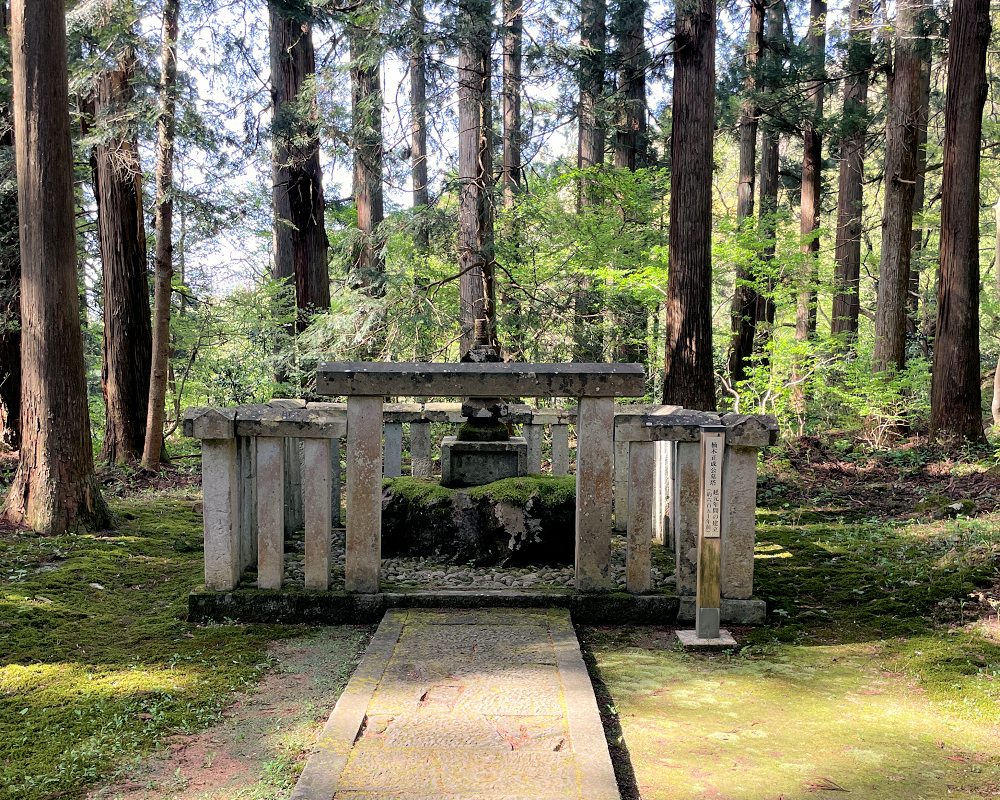 恵秀律師は、亡き叔父を偲んでこの地に供養の石塔を建立します。1574年(天正2年)の一向一揆により拝殿は焼失し、石塔も一部が欠損してしまいましたが、1668年(寛文8年)に福井藩主・松平光通によって補修が行われ、現在のように周囲に玉垣が設けられました。