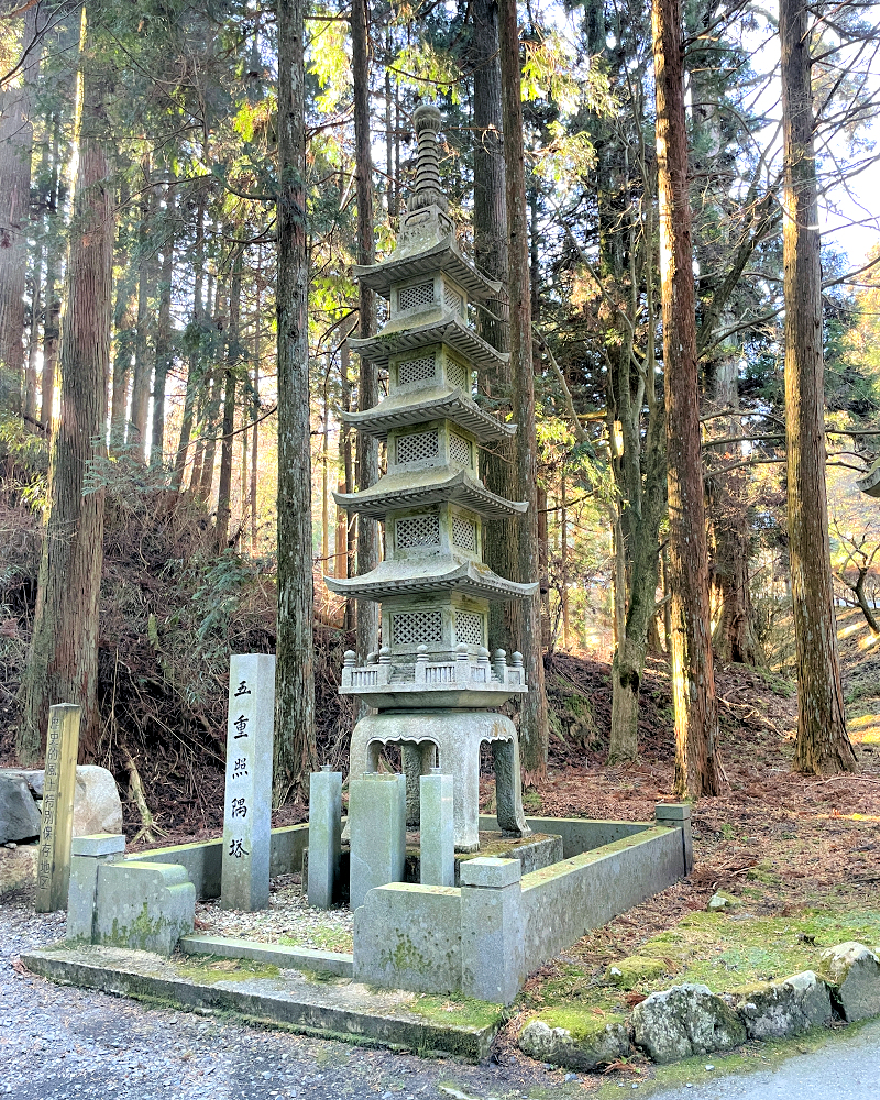 石造りの五重塔は、華美な装飾を排した簡素な佇まいながら、周囲の深い杉木立に静かに溶け込み、訪れる人を凛とした空気で包み込んでいます。